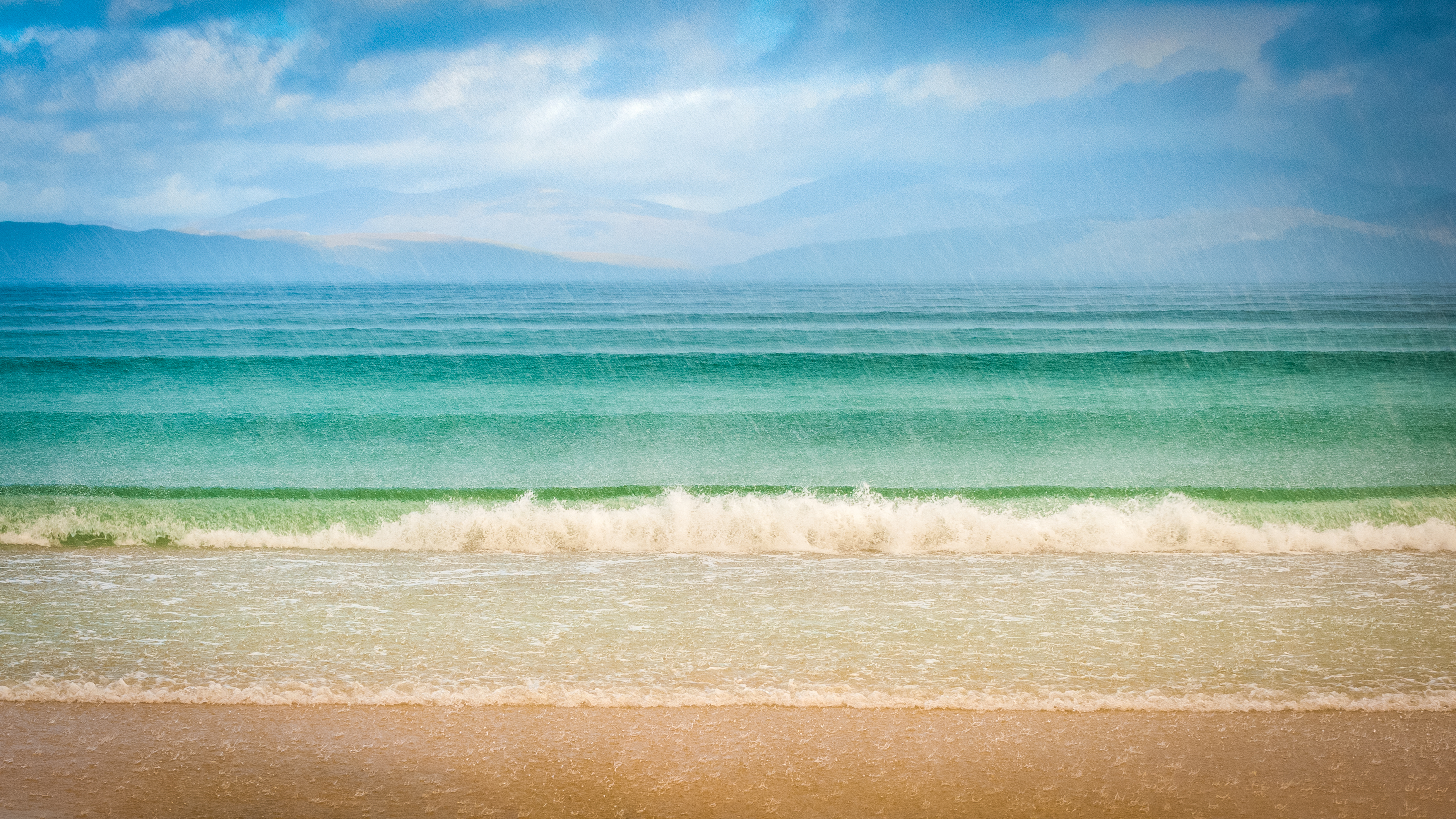 Photo taken on Scarista beach in the Outer Hebrides. As i walked along the beach in the sun, the rain suddenly came down! I could see the sun on the hills behind and the colours of the sea were amazing.