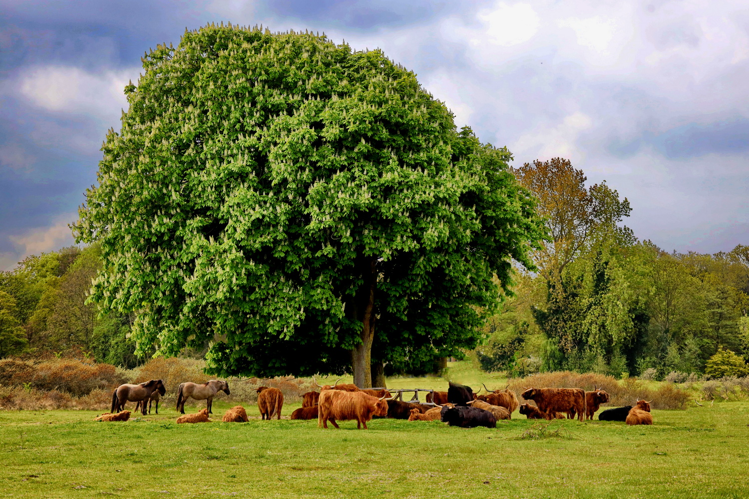 Konik paarden en Schotse hooglanders in natuurgebied Lentevreugd, Wassenaar