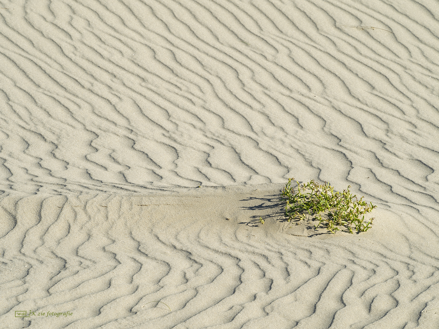 Hier worden de mooie, rustgevende zandgolven onderbroken door een plantje dat in het zand groeit.....de wind zorgt voor een verstoring van de zandgolven....
