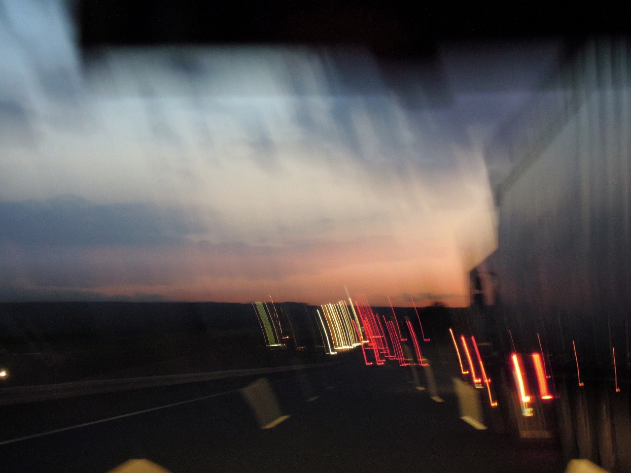 Deze foto is genomen bij zonsondergang op de snelweg met voorbijflitsend verkeer.
