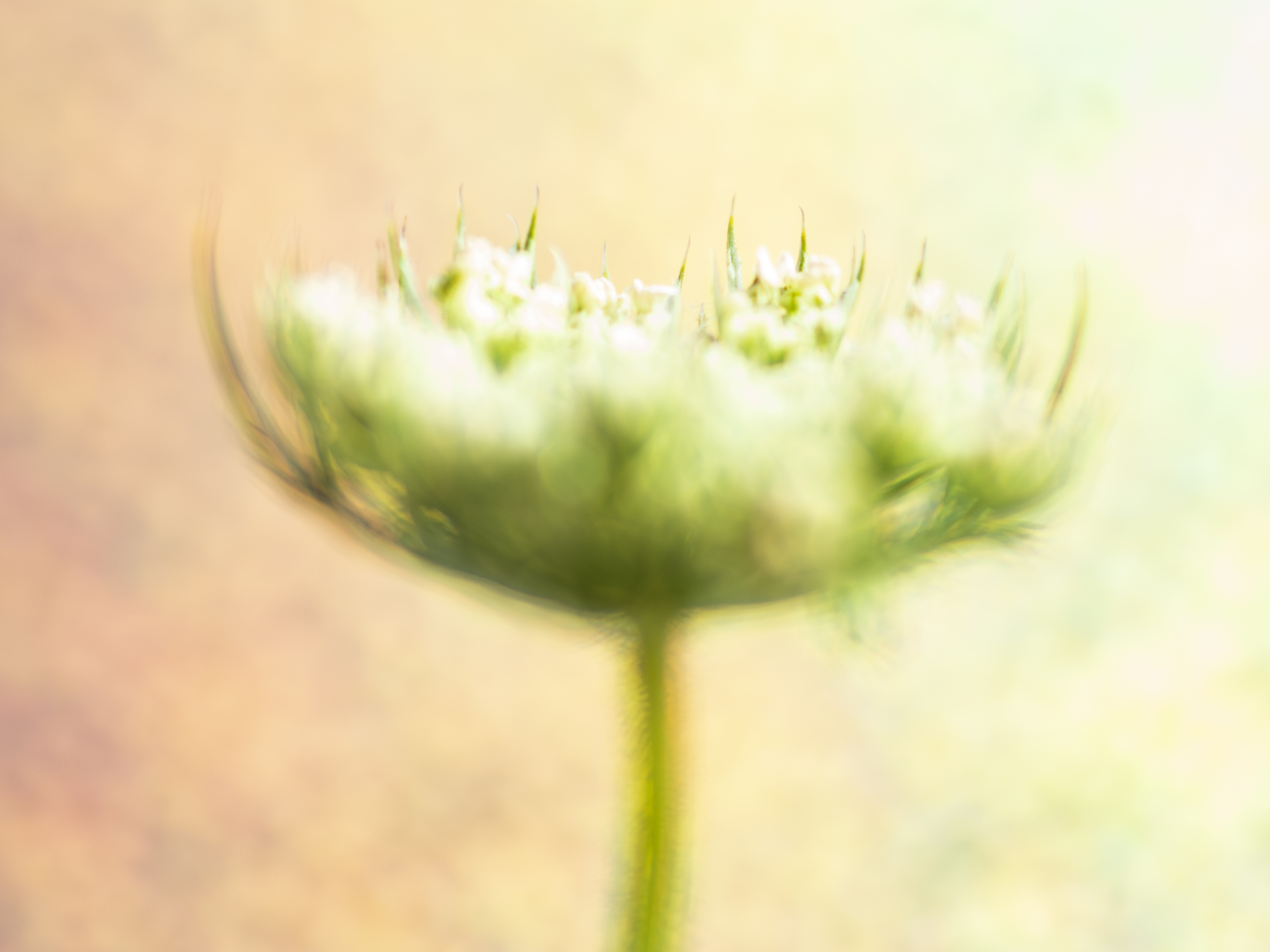 Door heel dicht op de bloem te gaaf fotograferen (bijna door de bloem heen) wordt de voorzijde van de bloem heel wollig en vaag, dit paste prachtig bij de achtergrond. Ik heb scherp gesteld op een paar achterste sprietjes van de bloemknop. De foto is gemaakt met de Lensbaby Edge 80, die ik gekanteld had zodat er nog meer onscherpte en zachtheid ontstond!!