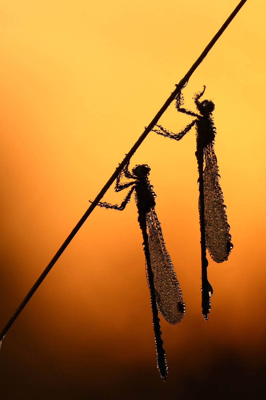 2 Tengere pantserjuffers onder de dauw op een schitterende ochtend.