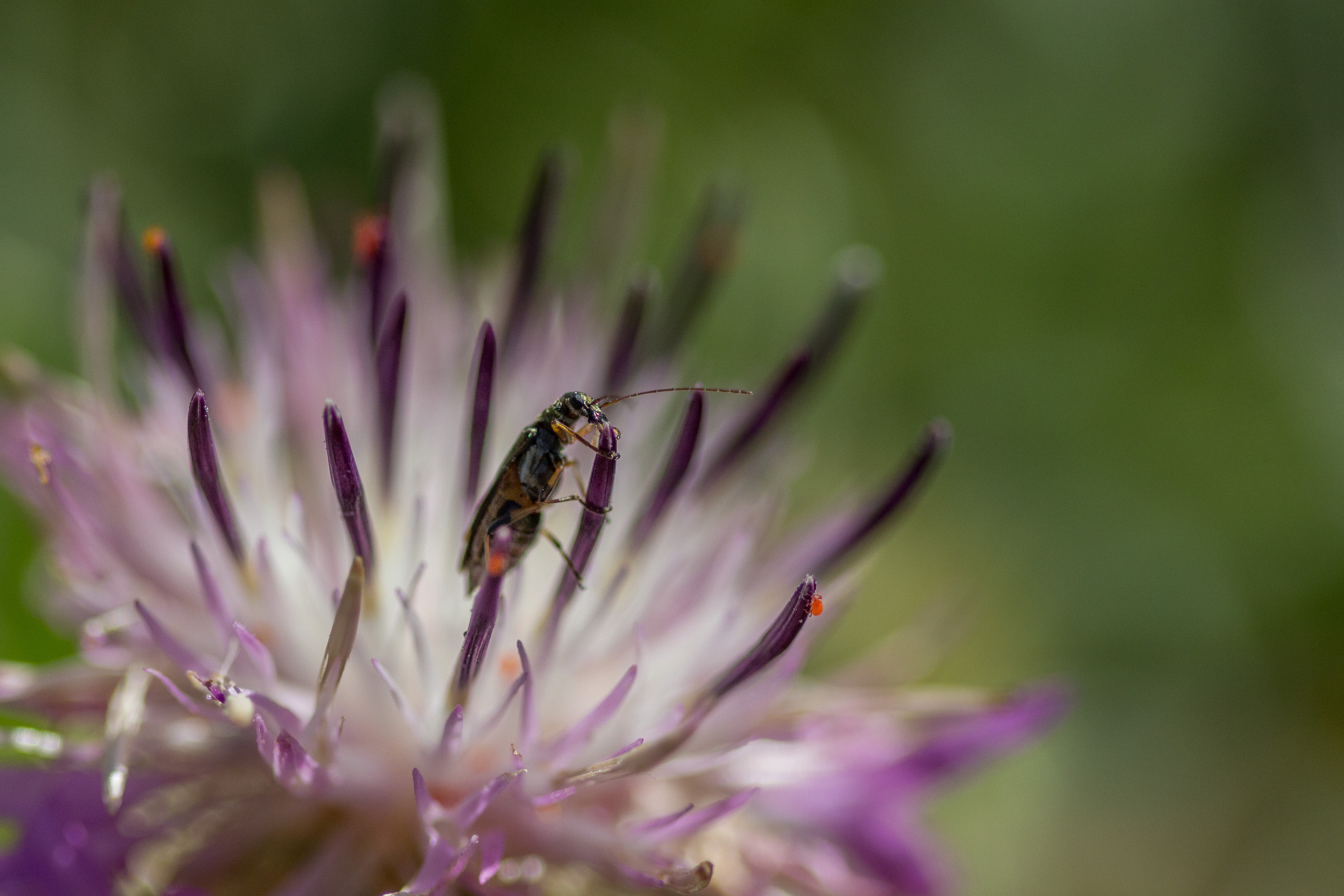 Deze kleine kever is op jacht naar de insecten die leven op de bloem.