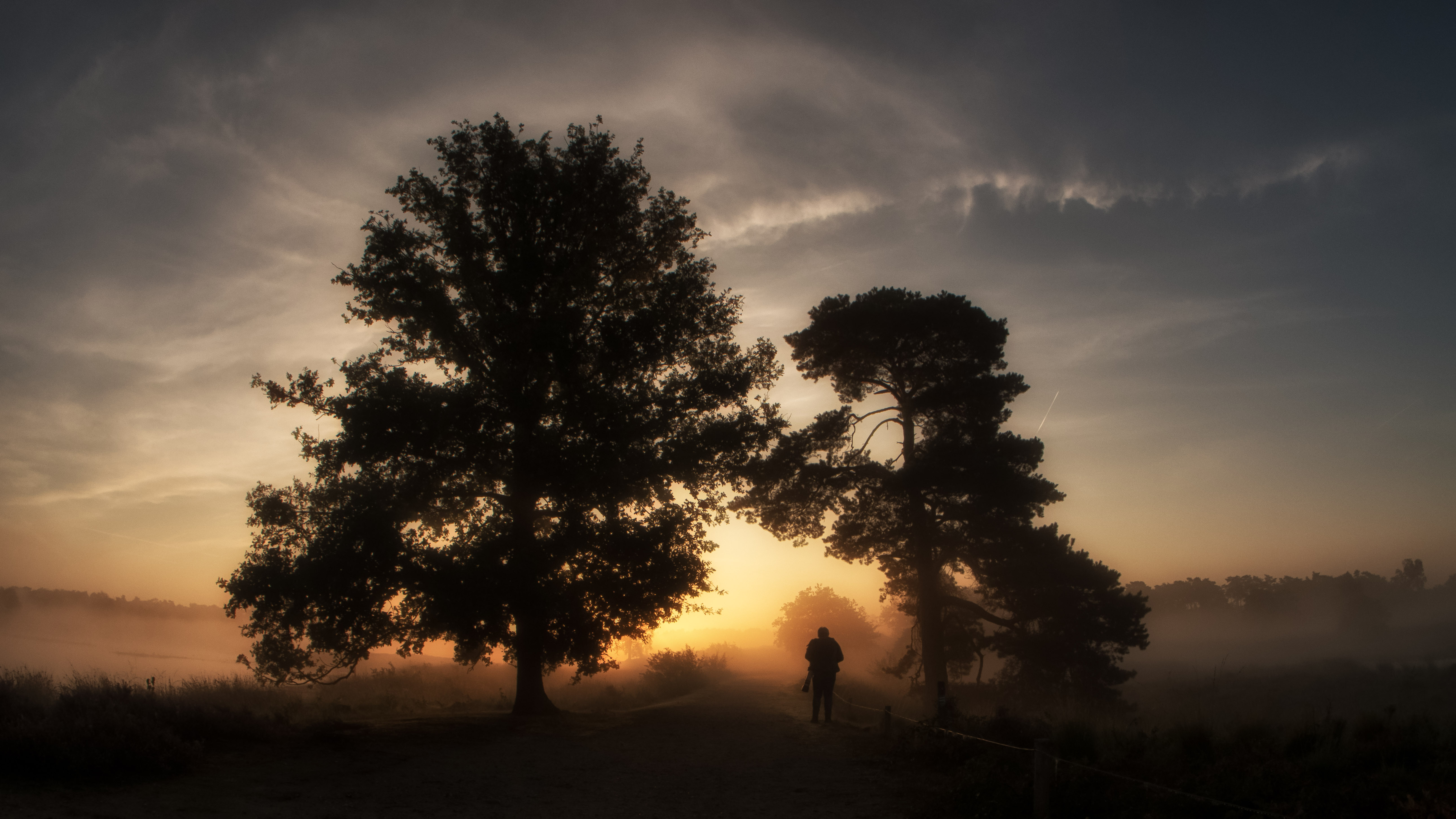 Op pad op de bloeiende heide bij zonsopkomst...
