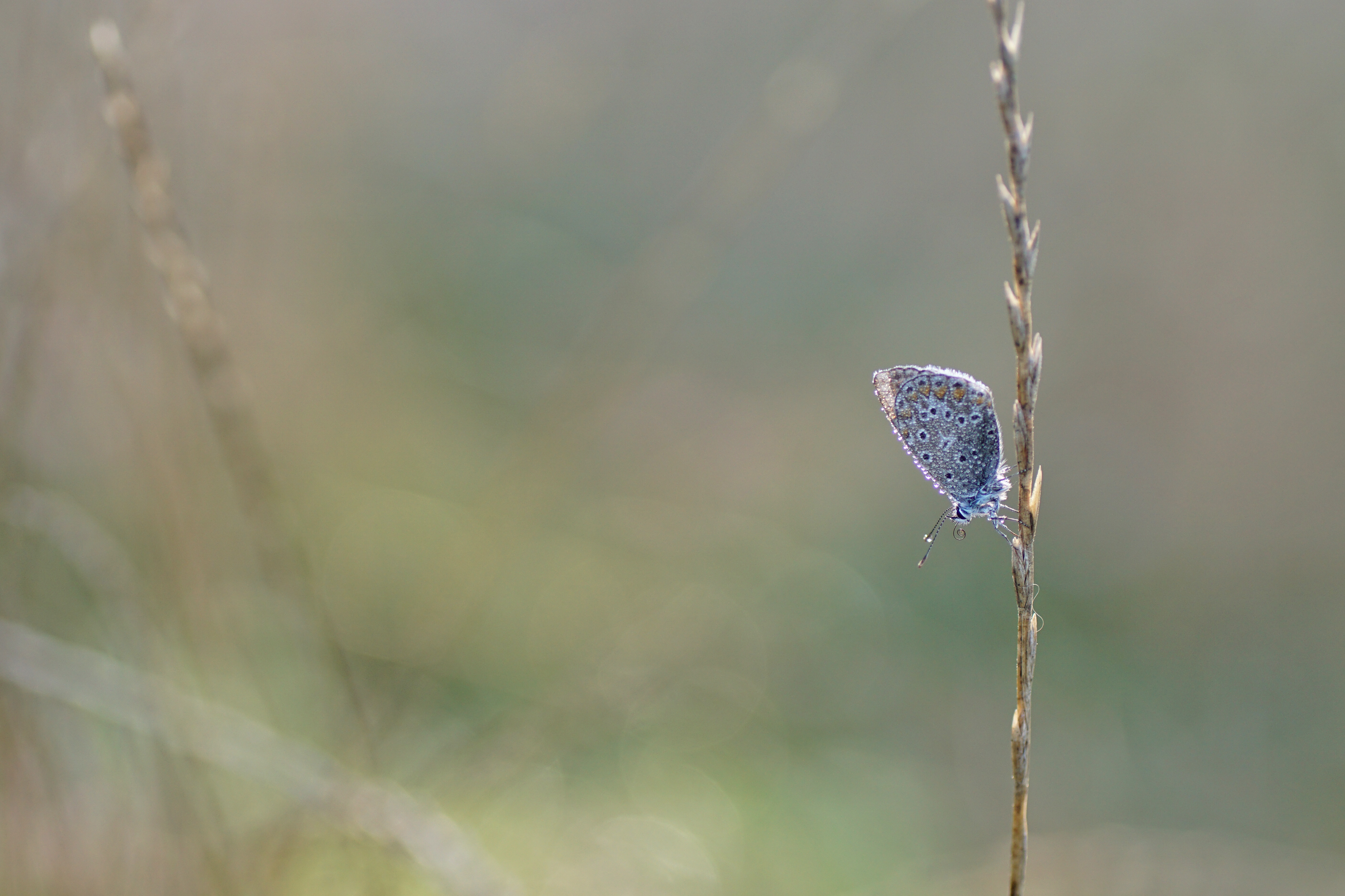 Hier hangt de vlinder nog gehuld in dauwdruppels.