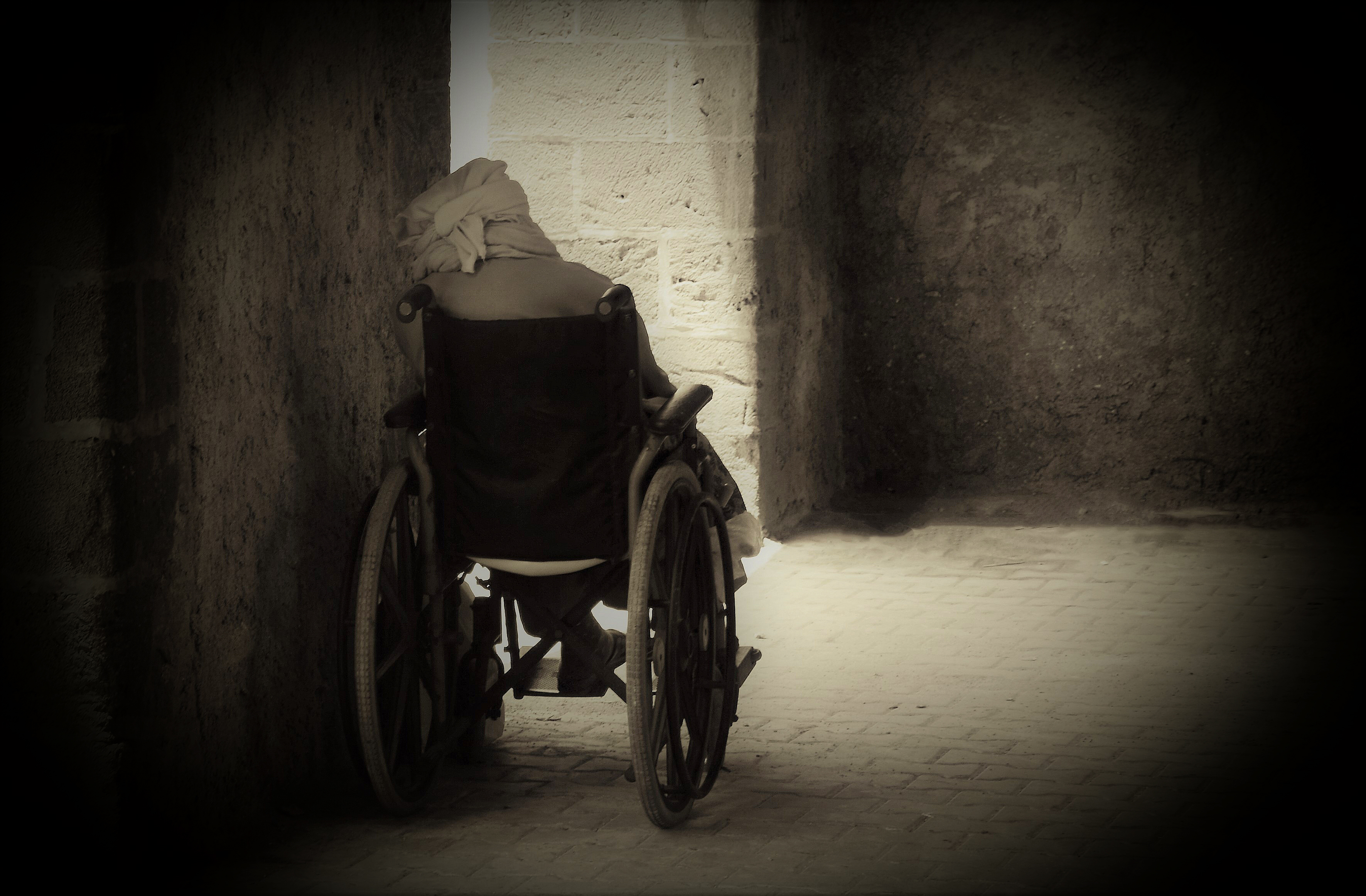 Oude man in rolstoel in Essaouira in Marokko