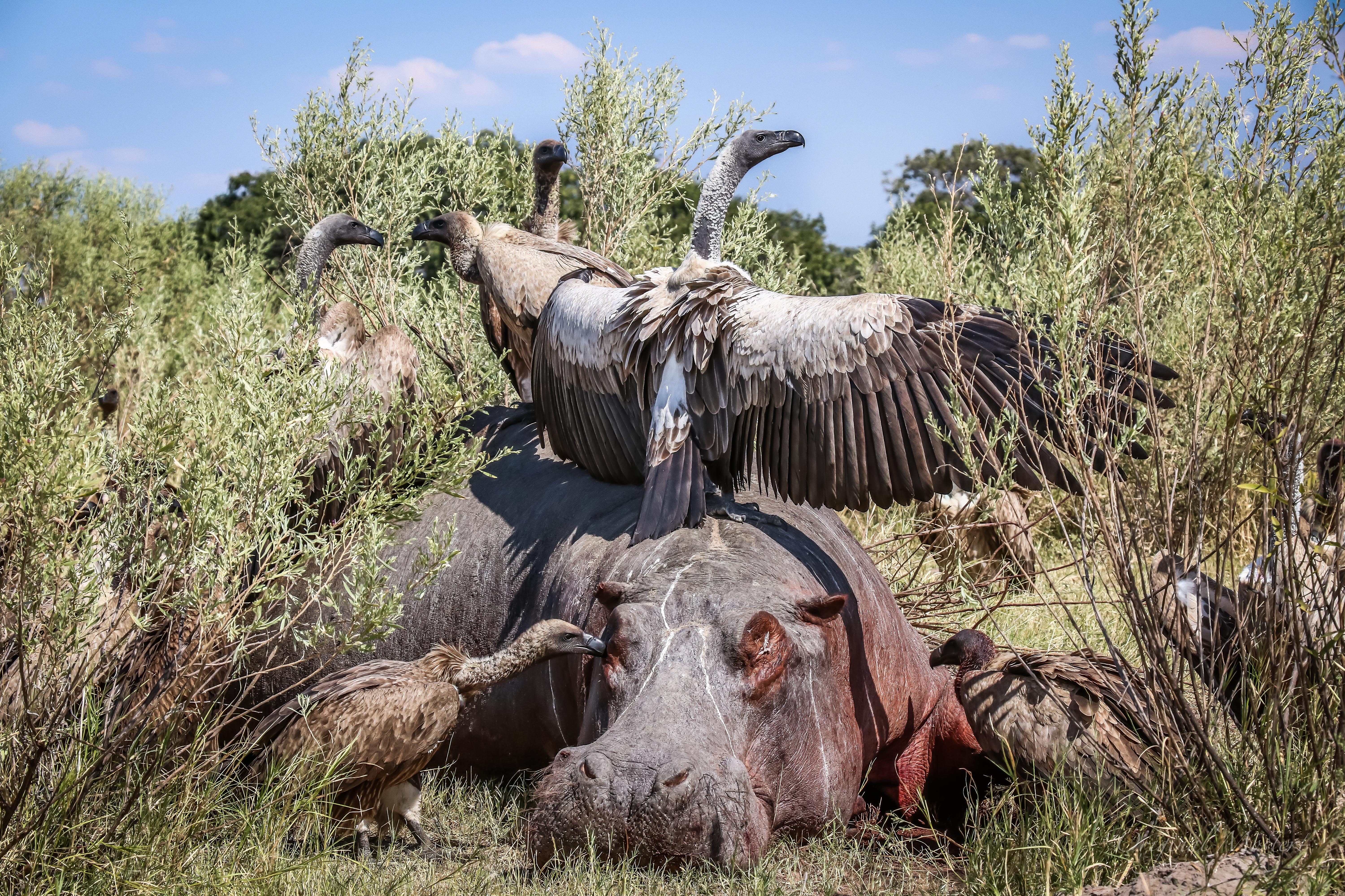 Overleden Nijlpaard is avondmaal voor Gieren in Moremi National Park, Botswana