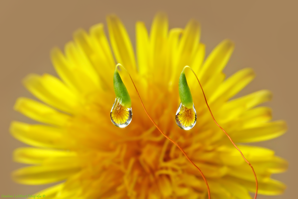 Twee druppeltjes aan mos-stengeltjes laten de Paardenbloem erachter zien.