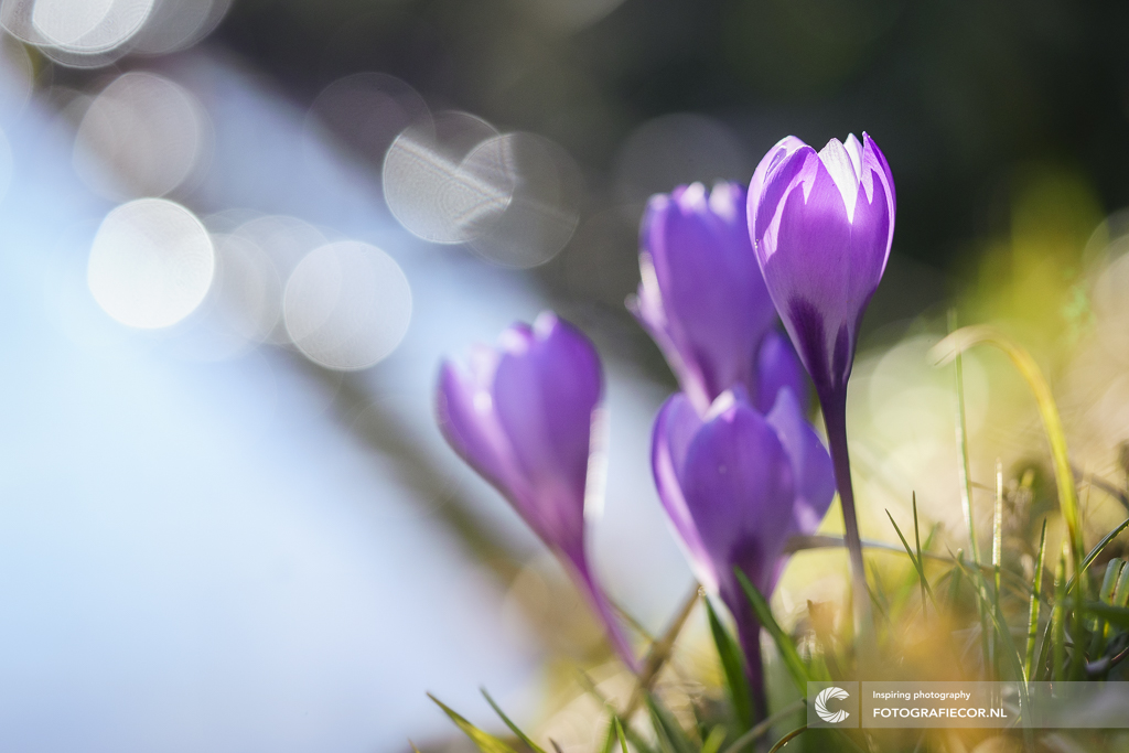 Een intieme close-up die de delicate schoonheid van krokussen vangt. Badend in het zachte licht van een ontluikende lentedag. De paarse bloemblaadjes, met hun subtiele nuances en fluweelzachte textuur, contrasteren met de vage, dromerige achtergrond van bokeh-lichtcirkels. De onscherpe groene sprietjes aan de basis van de bloemen suggereren een ontwakend landschap, terwijl de compositie de fragiele essentie van de lente benadrukt.