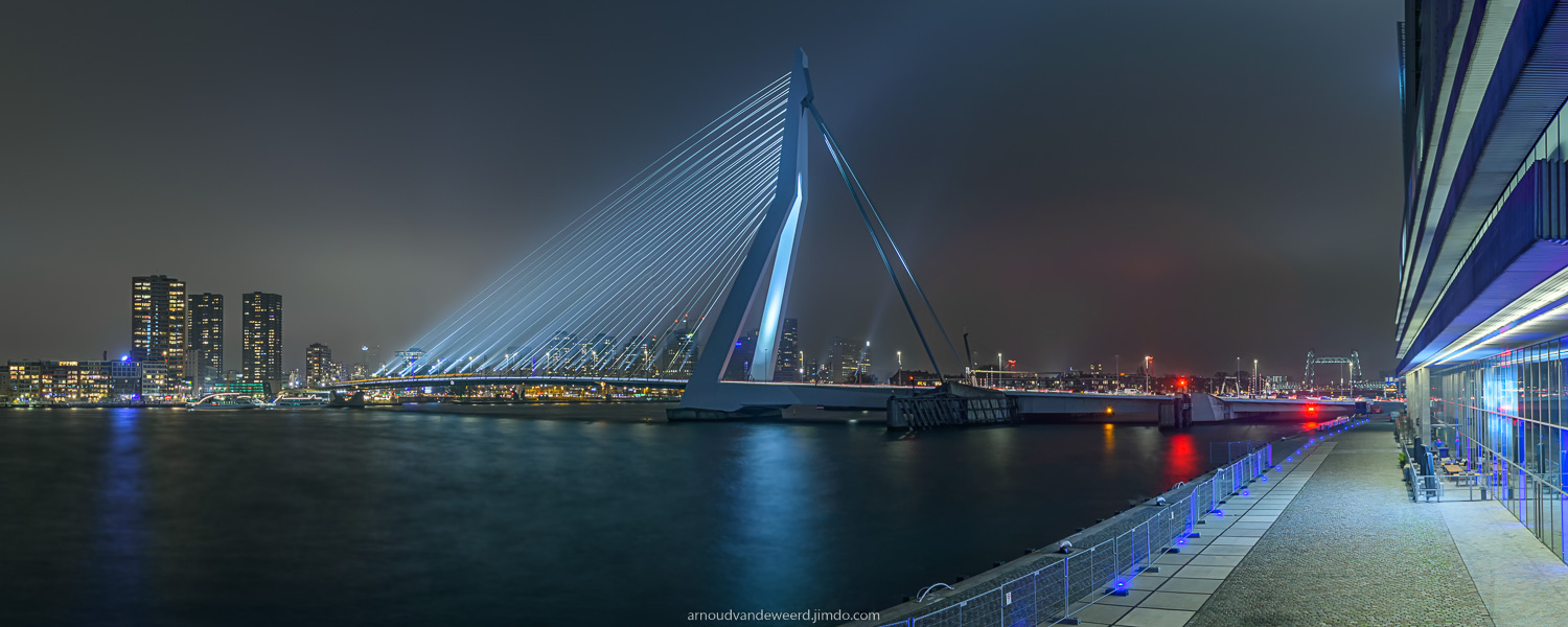 Graag wilde ik de Erasmusbrug en de Hef (brug rechts achterin de foto) in één foto vangen. Om de beeldhoek van circa 180 graden te kunnen beslaan is deze panorama opgebouwd uit 12 verschillende foto's (voor de technici: 4 HDR foto's waarbij elke HDR foto is opgebouwd uit 3 verschillende belichtingen). Kost wat moeite maar dan heb je ook wat :-). www.arnoudvandeweerd.jimdo.com