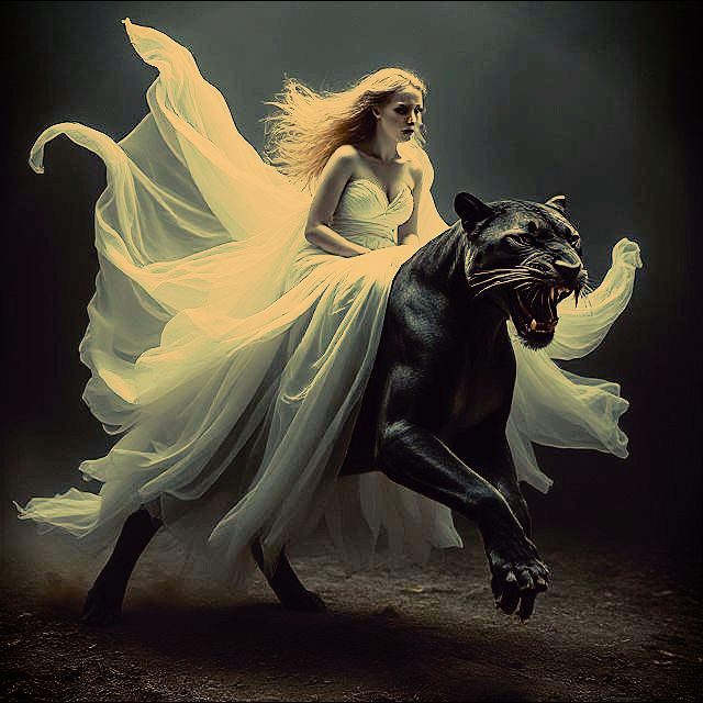 Ze berijdt de schaduwen, de gratie van een middernacht,