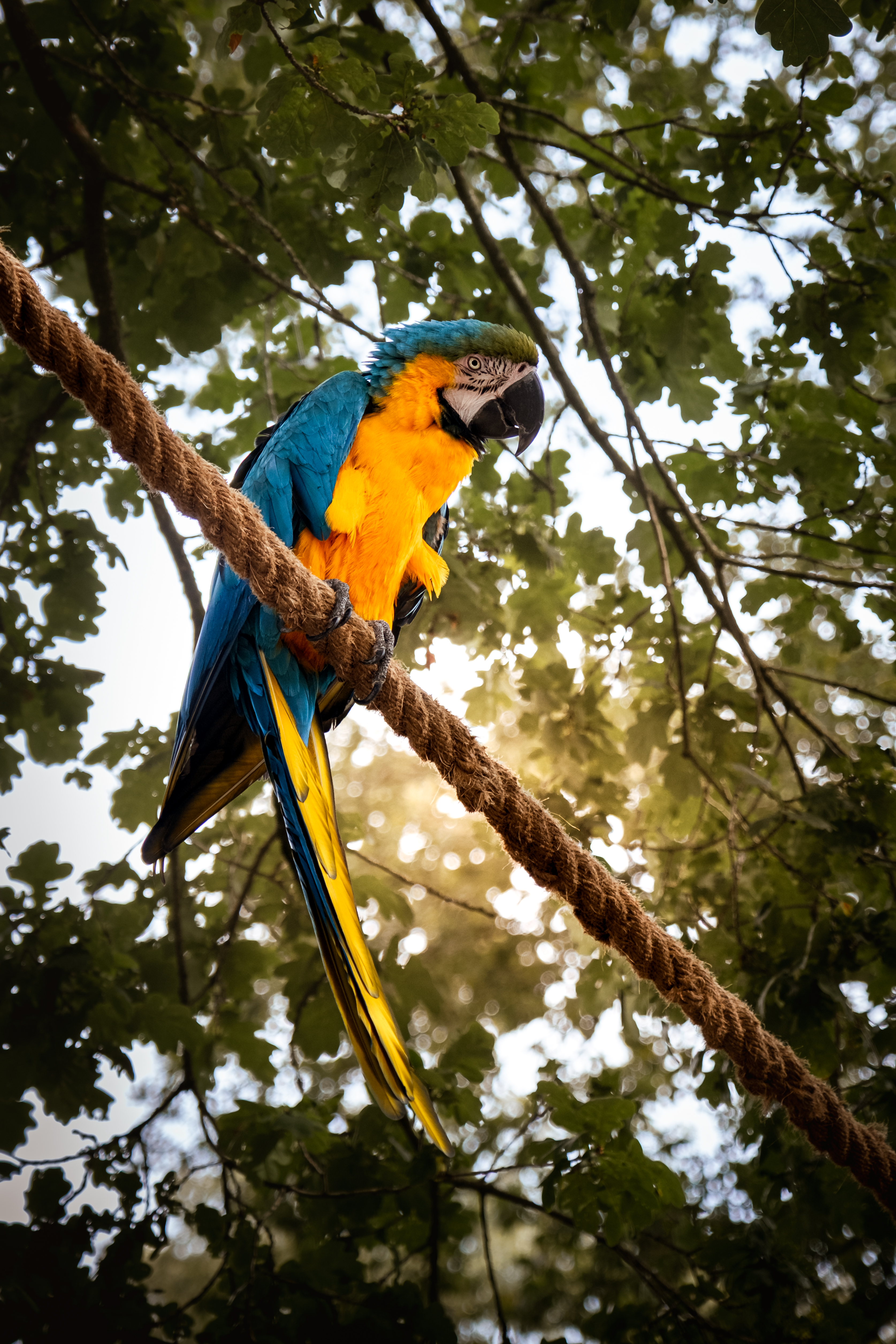Tijdens de vakantie op een kinderboerderij hoorde ik ineens een gek geluid. Zat er een grote papagaai boven mijn hoofd.