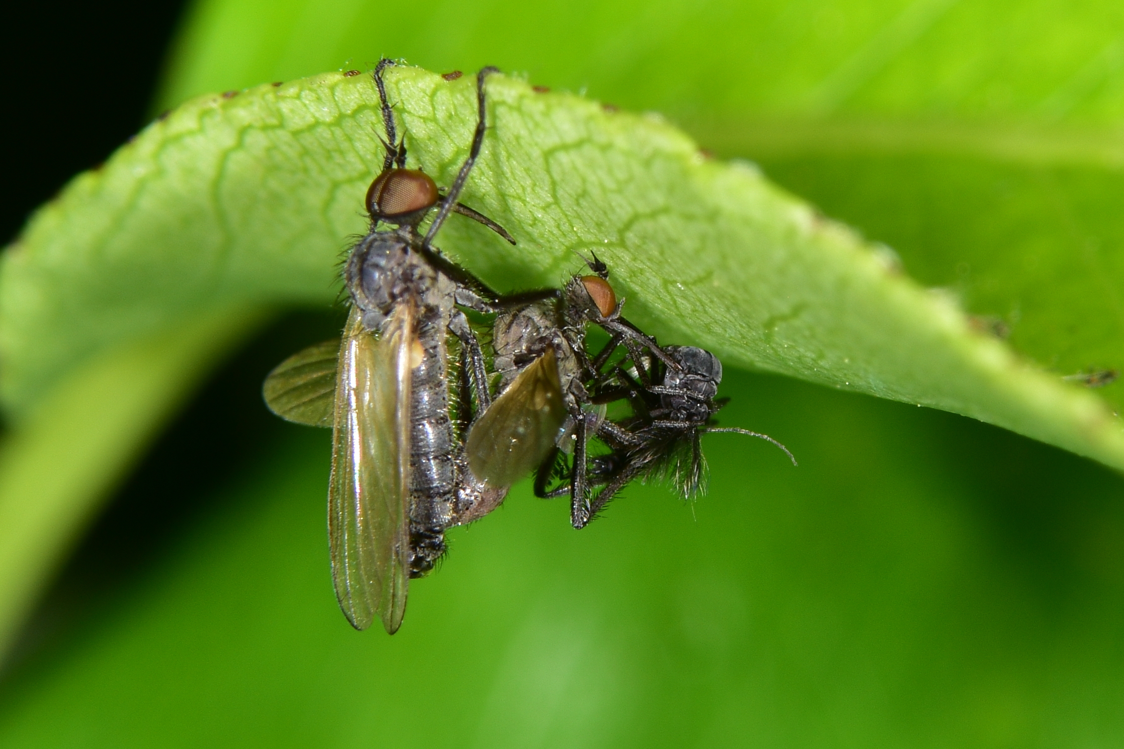 Parende roofvlieg. Vrouwtje wordt zoet gehouden met een prooi. Kwamen aanvliegen en rustte even uit hangend aan een bladrand.