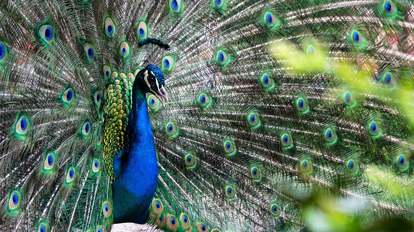 Er liep een prachtige pauw midden in attractiepark De Efteling. Deze foto is gemaakt met een Canon EOS M10 met kitlens.