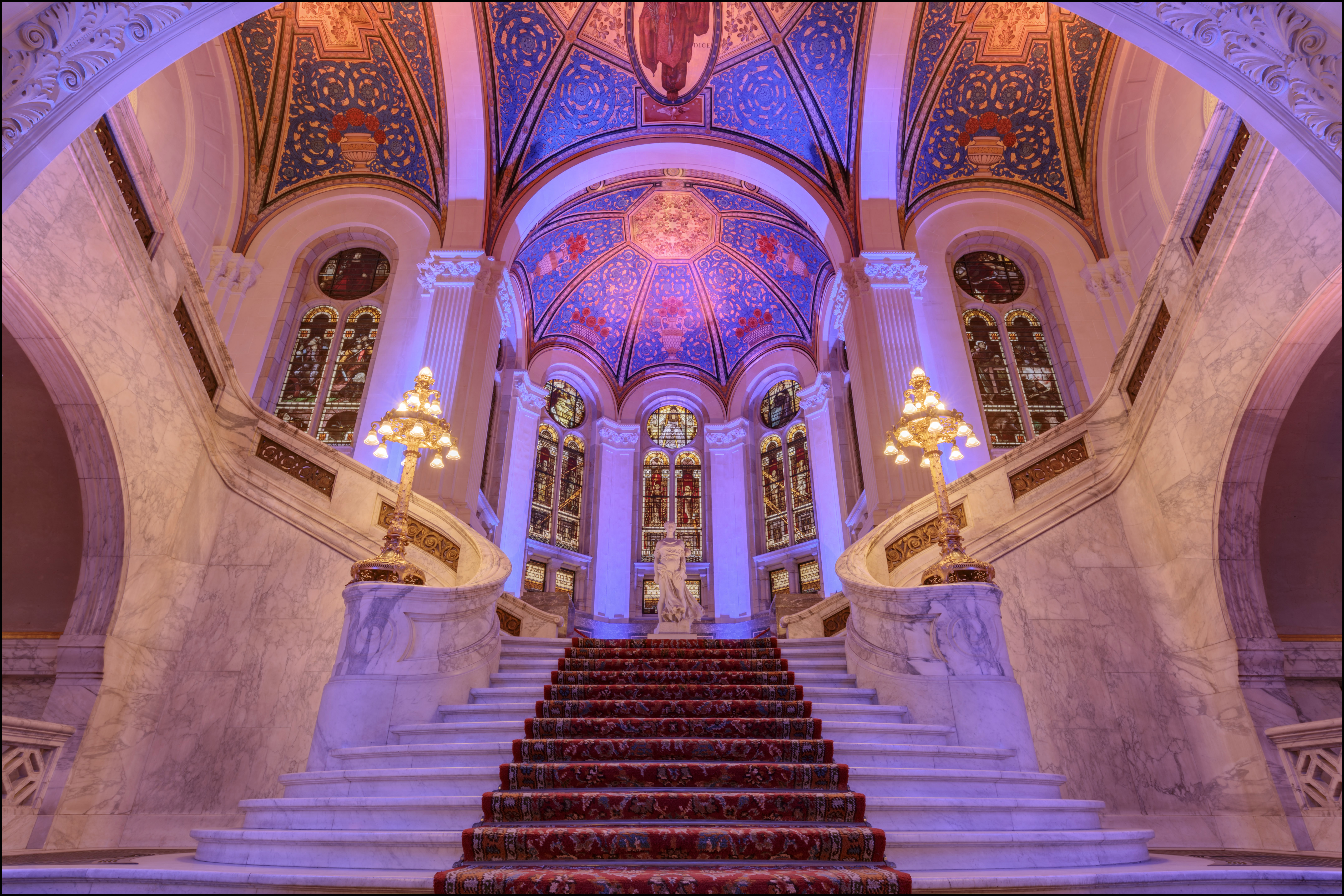 Het Vredespaleis in Den Haag tijdens de feestdagen rond Kerst en Oud & Nieuw zowel van binnen als van buiten sprookjesachtig verlicht.