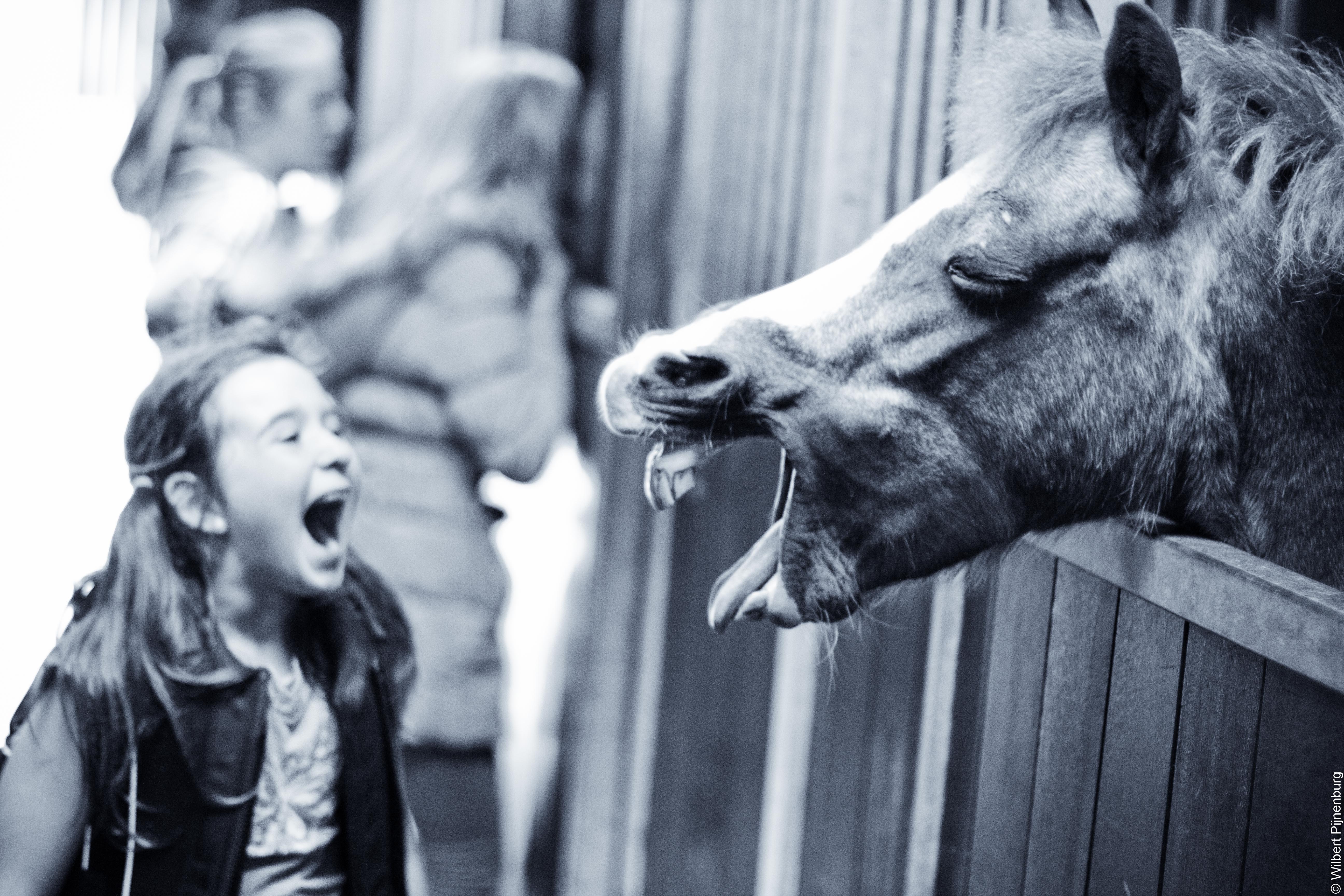 Mijn dochter rijdt paard bij de Larense Manege. Toen het paard, genaamd Peanut, aan het gapen was heeft mijn dochter het paard geimmiteerd wat een erg humoristisch plaatje opleverde.