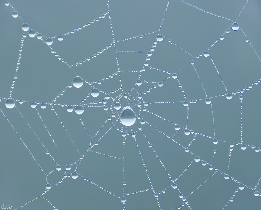 Een spinnenweb met mist-druppeltjes.