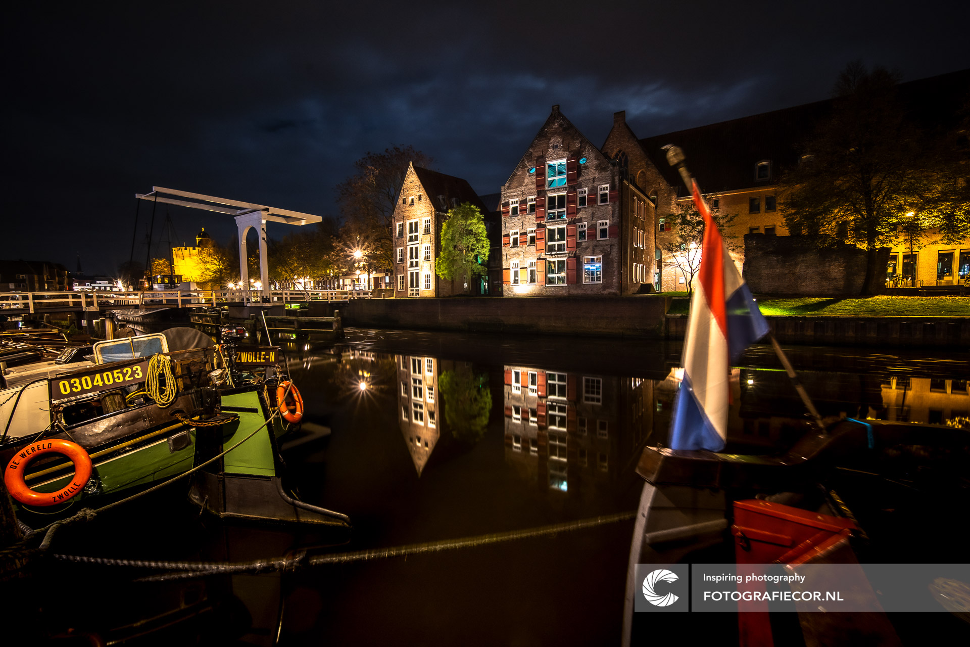 Aan deze oude stadsgracht staan nog een paar oud pakhuizen buiten de stadsmuur. Het witte houten klapbrugje, de oude vrachtschepen, de Hollandse vlag en de reflectie in het water pakte mijn aandacht deze avond. De dreigende avondwolken en driehoeksperspectief maakt het Hollandse plaatje van erfgoed uit de 'gouden eeuw' compleet.