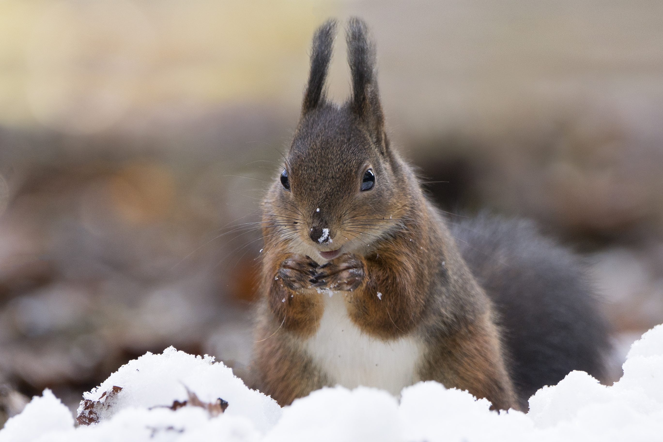 Hier zit de eekhoorn een nootje op te peuzelen. Voor dit standpunt plat op mijn buik bij min 1