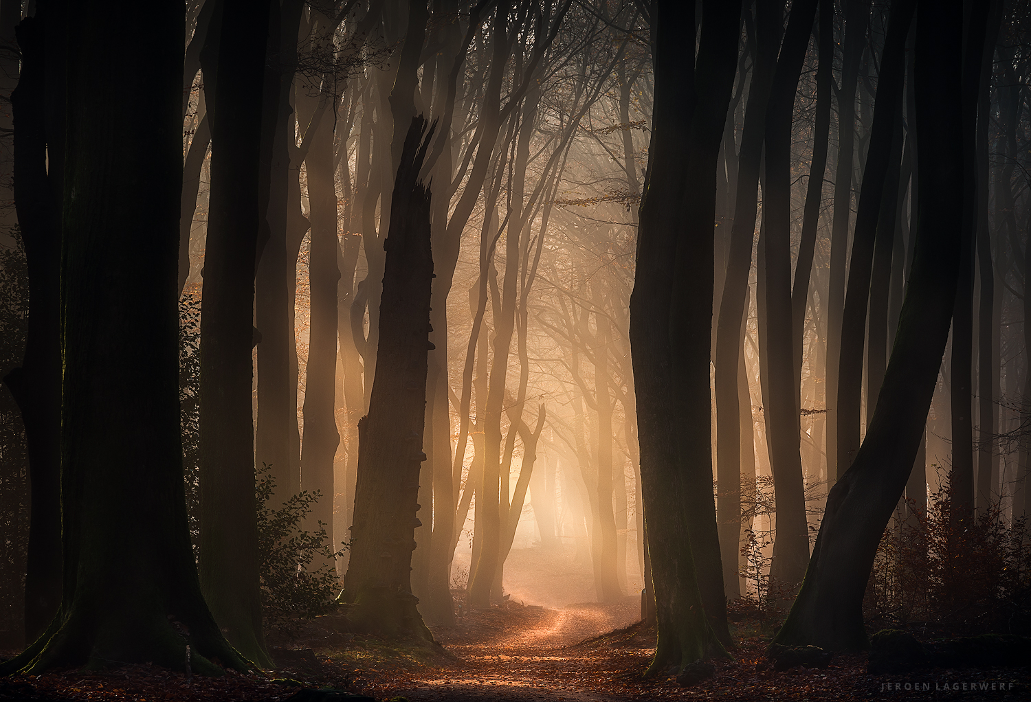 Door tegen het licht te fotograferen en in te zoomen, wordt de mist intenser en verdwijnen de kleuren. Met een beetje onderbelicht en een vignet wordt de foto dan donker en moody. Precies wat ik zocht!