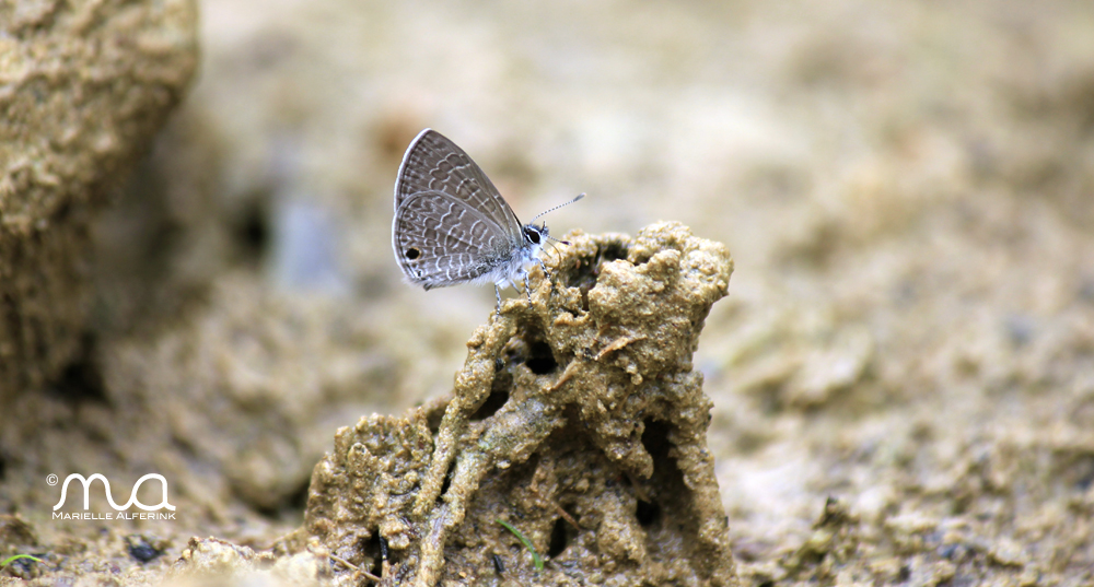 Mijn ogen probeerden er wat van te maken en ik kroop wat dichterbij. Als een prinsesje bleef het zitten en dus haalde ik langzaam mijn camera tevoorschijn. Door de zoomlens kon ik het nu beter zien. Het was een piepklein vlindertje en misschien iets meer dan een halve centimeter groot.