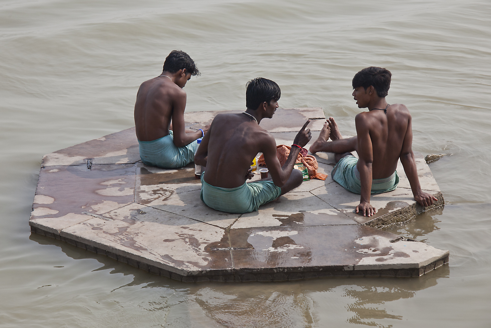 Drie jongens zitten op een bijna droog gevallen plateau in de Ganges rivier.Ik heb hier een serie van gemaakt hoe dit plateau een rol speelt in het dagelijks leven.Tijdens de Moesson staat hij onder water, maar daarna valt hij droog en wordt intensief gebruikt