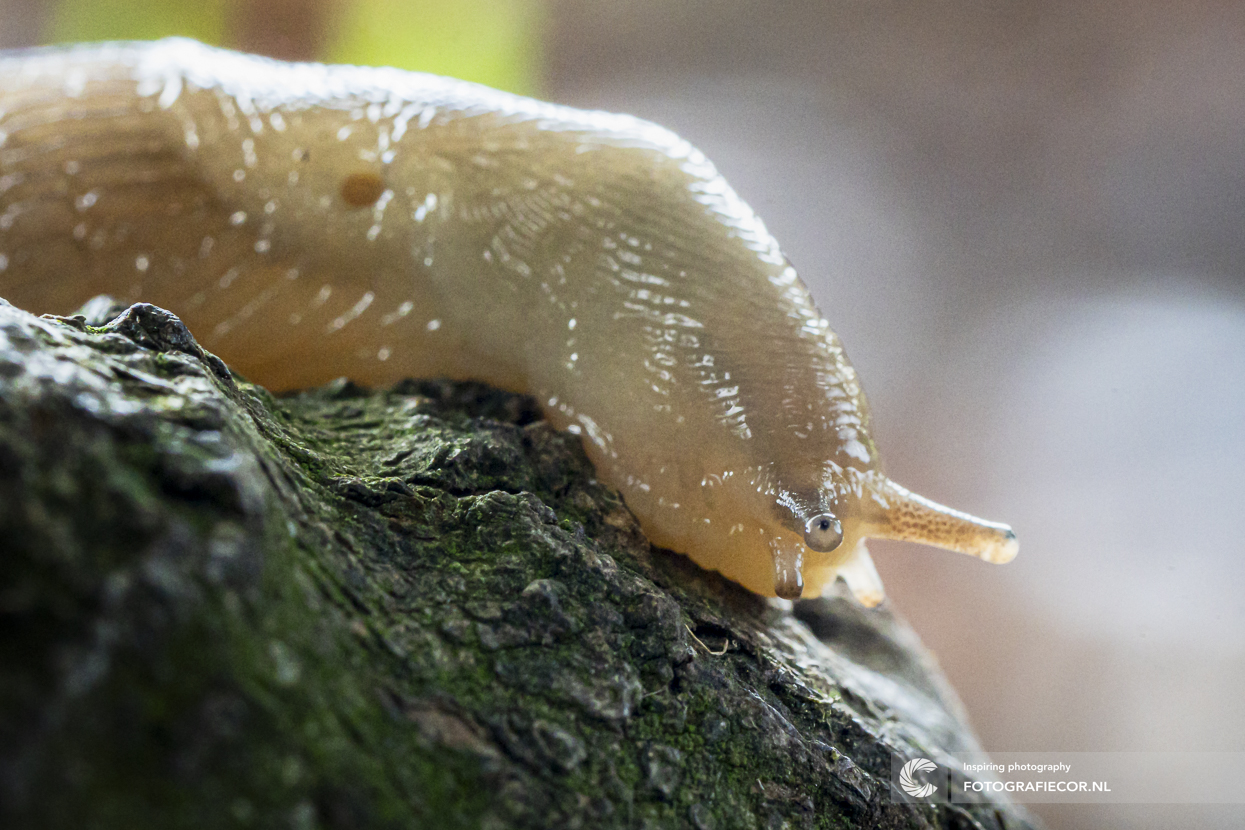 Lig je languit op de bosgrond tussen de dwarrelende herfstbladeren en afgevallen takken van de laatste najaarsstorm, komt dit opeens door je lens voorbij kruipen. Enigszins verbaasd zat het mij strak aan te kijken terwijl ik druk in de weer was enkele paddestoelen te fotograferen. De camera een zwaai naar links gegeven en met de macrolens dit portretje gemaakt van dit naaktmodel. Nog gevraagd of er een bewaar was voor het portretrecht of dat er een afdruk die kant op moest maar verbazend genoeg totaal geen reactie...dan deze strakke blik die mij bleef aankijken ;-)