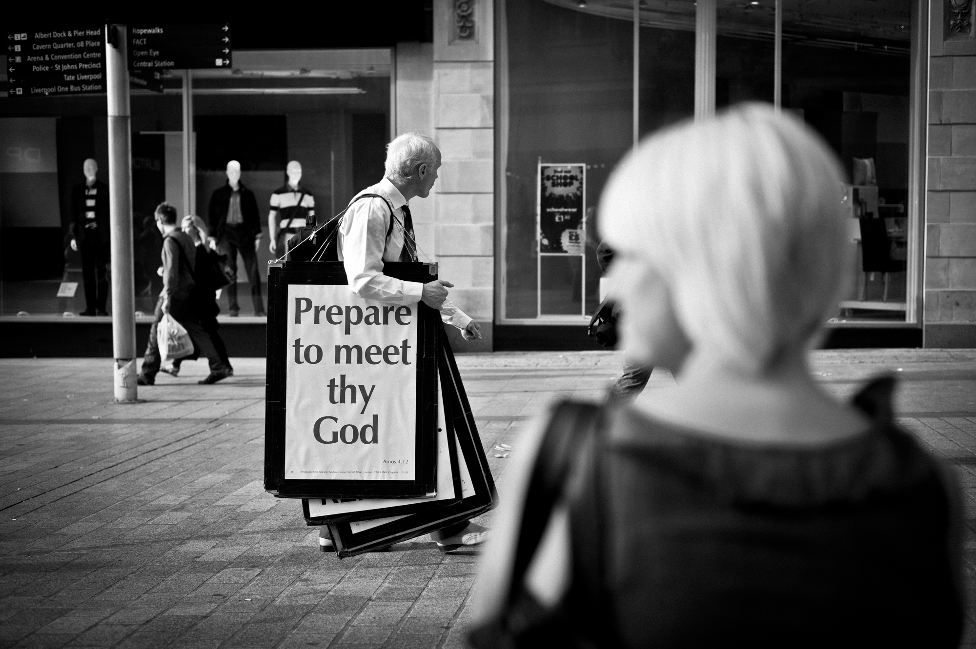 Straatfoto gemaakt in Liverpool. De dame op de voorgrond had niet in de gaten dat ze op de foto terecht kwam. En de man met de boodschap waarschijnlijk al helemaal niet. Volgens mij krijg je de mooiste foto's als je zo weinig mogelijk ingrijpt in de situatie.