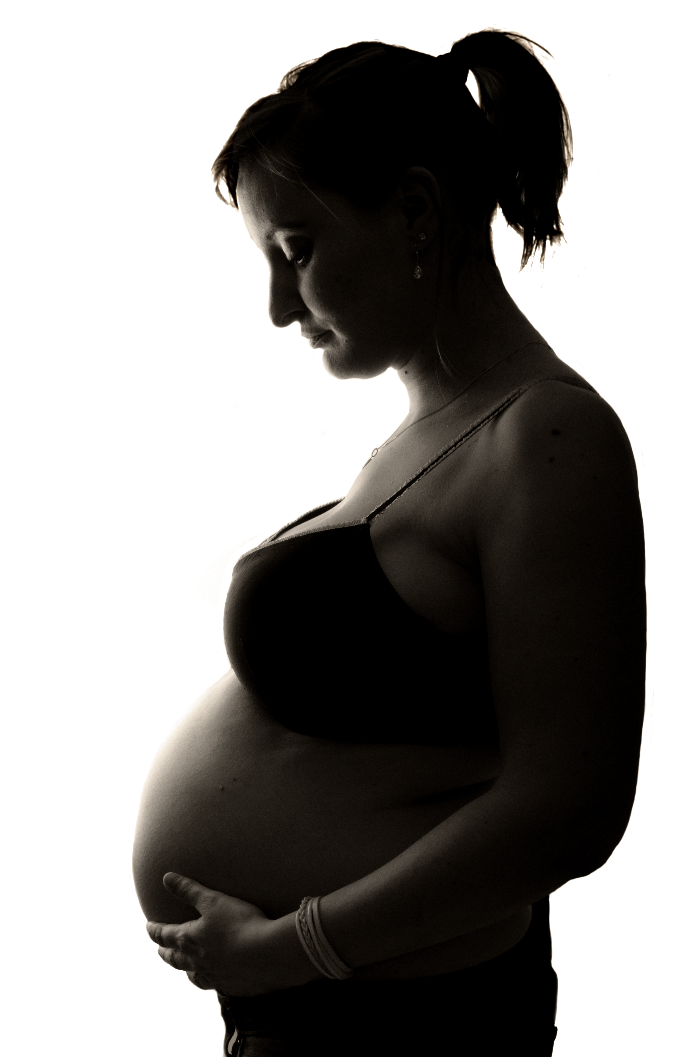 Een jonge moeder met haar bolle buik in tegenlicht gefotografeerd.