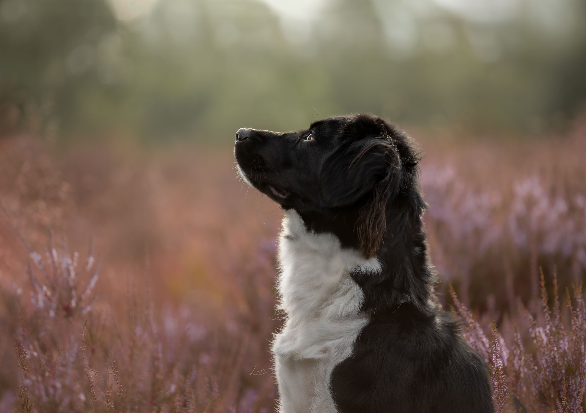 Puppy yara tussen de langzaam beginnende opkomende heide.