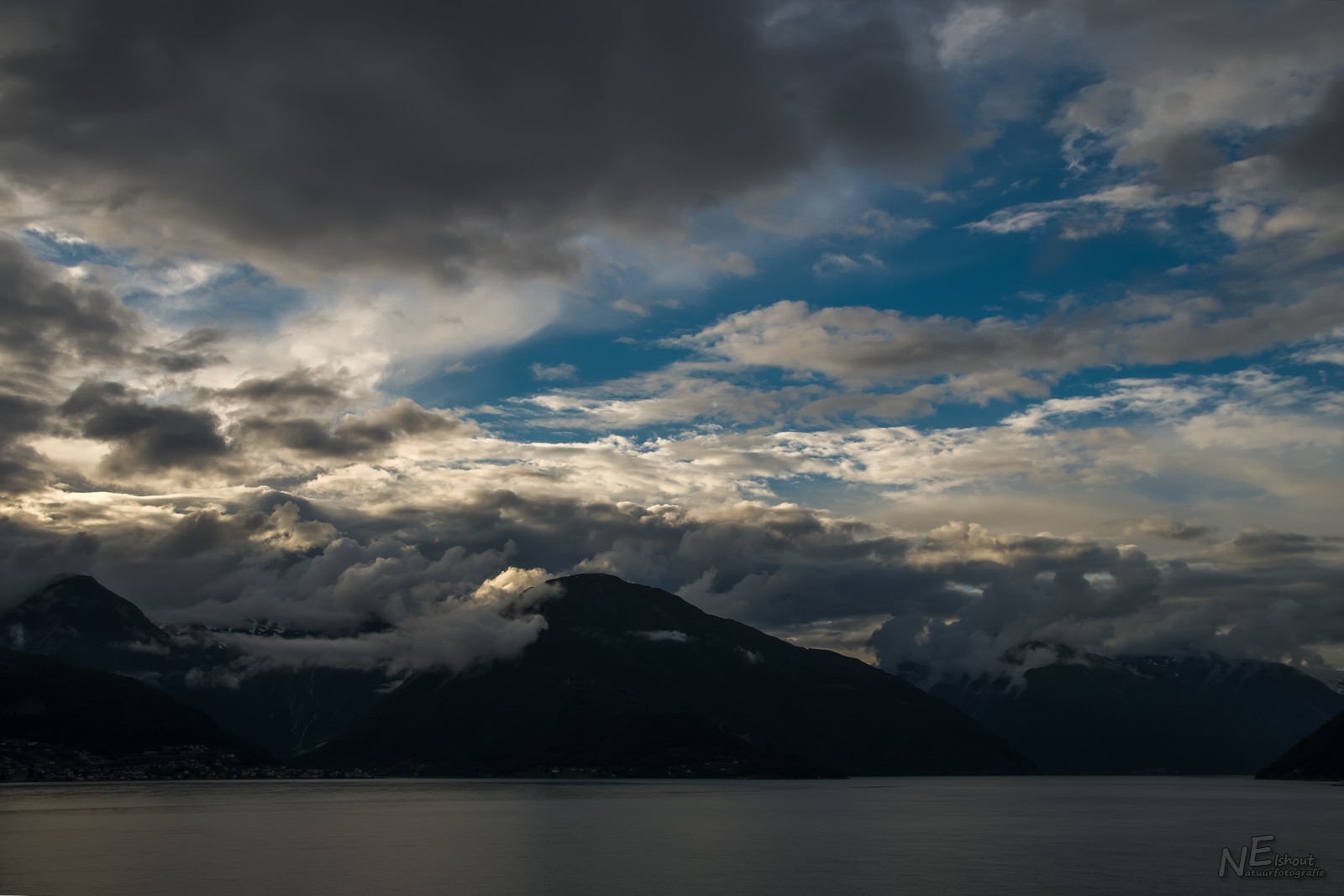 Zoals deze laaghangende wolken boven een Fjord.