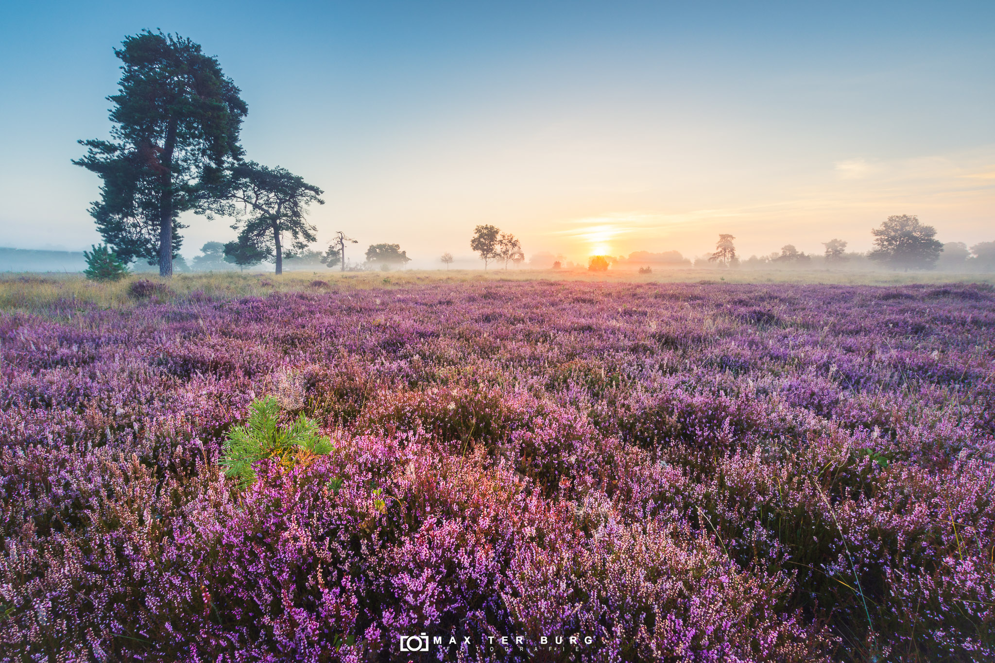et Leersumse veld kleurt weer prachtig paars. Bij de opkomende zon krijgt de paarse heide nog meer kleur. De Oranje gloed in de achtergrond maakt het plaatje helemaal compleet. Een mooi weids uitzicht met prachtige kleuren met de sfeervolle toevoeging van de mist.