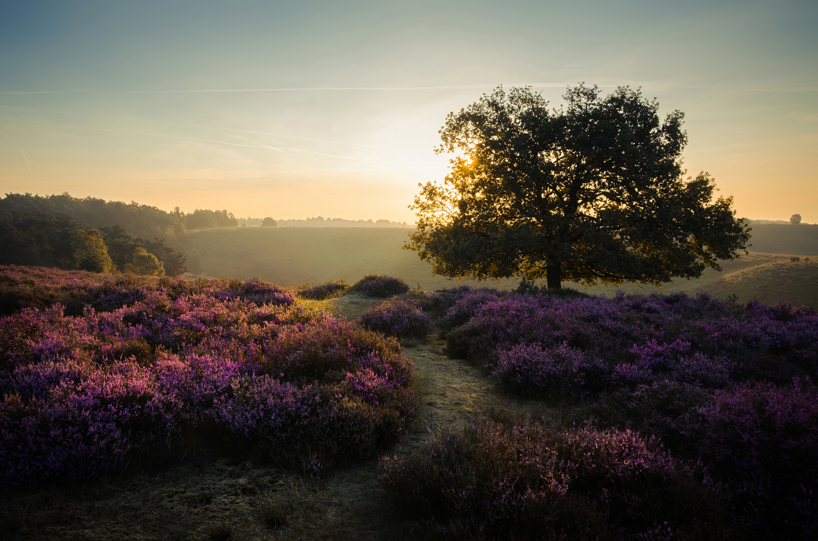 Deze foto is gemaakt tijdens de zonsopkomst op de Posbank in augustus 2017. De maand dat de heide in bloei staat.