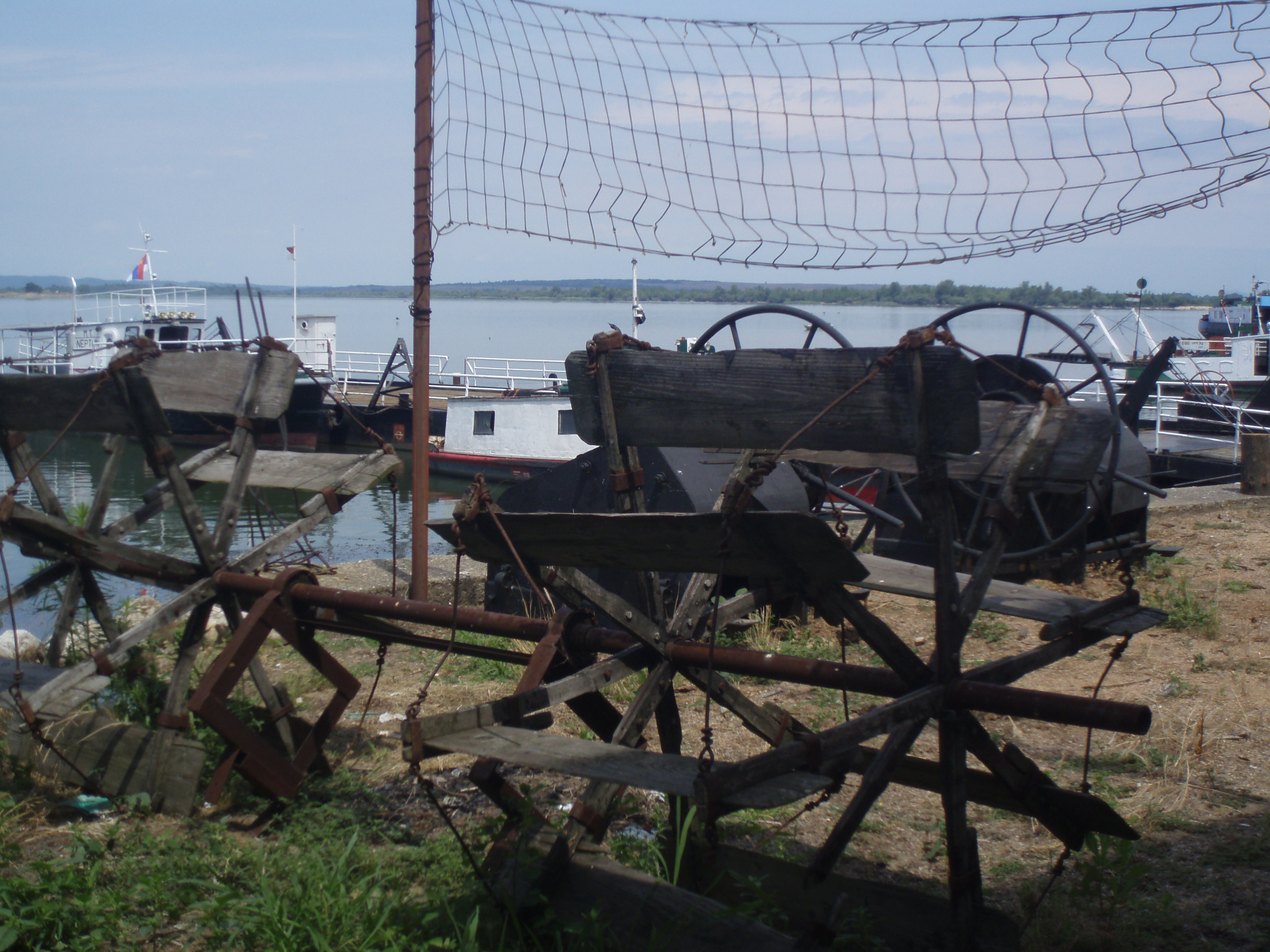 Dit tafereel kwamen we tegen, een veerpont, bij een restaurant, aan het eind van een doodlopend weggetje in Ram, Servie. De veerpont leek nog te varen, maar wij hebben niet gezien dat er gebruik van werd gemaakt.