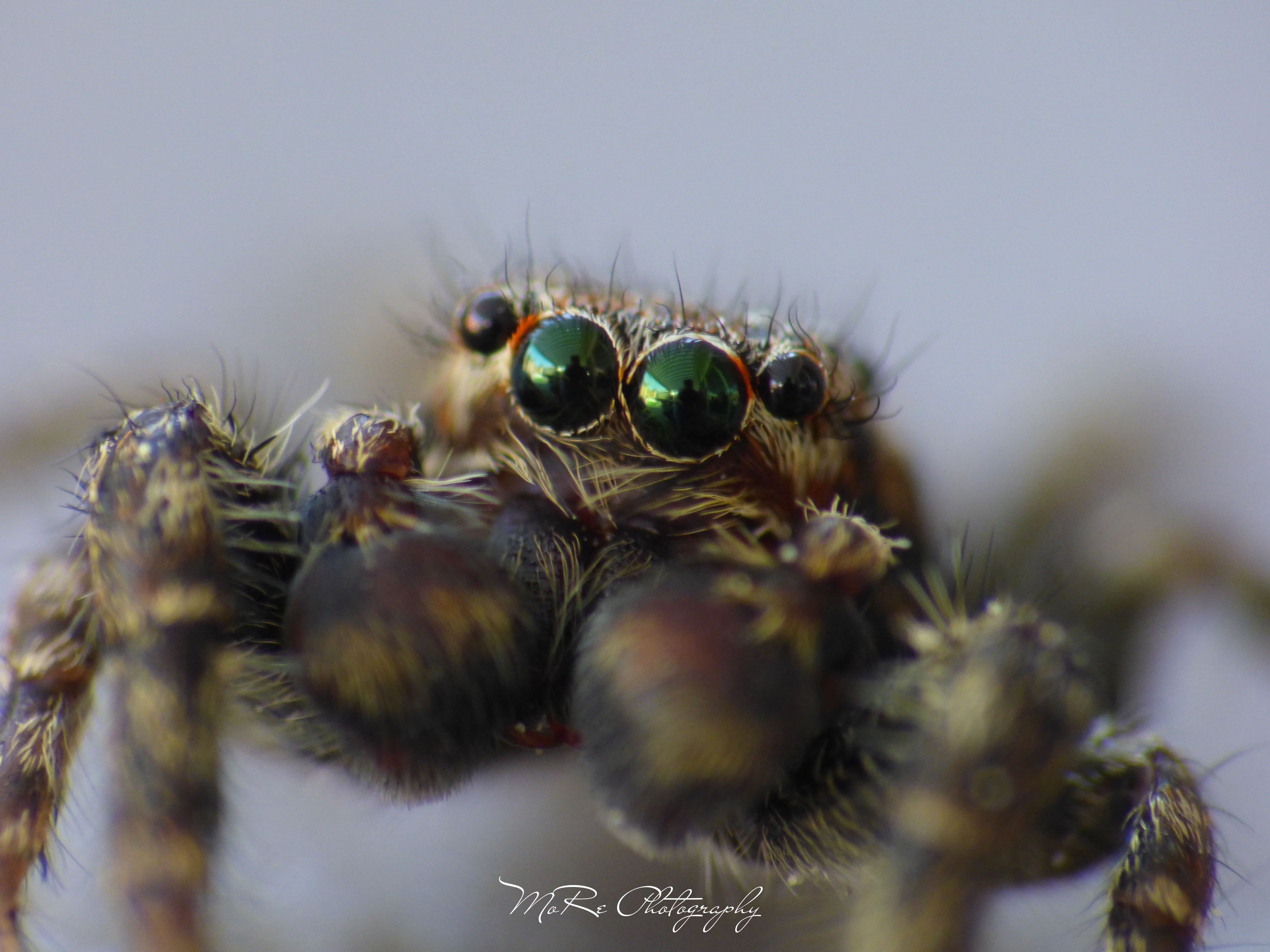 In de reflectie in de ogen van het spinnetje is mijn silhouet en onze tuin te zien!