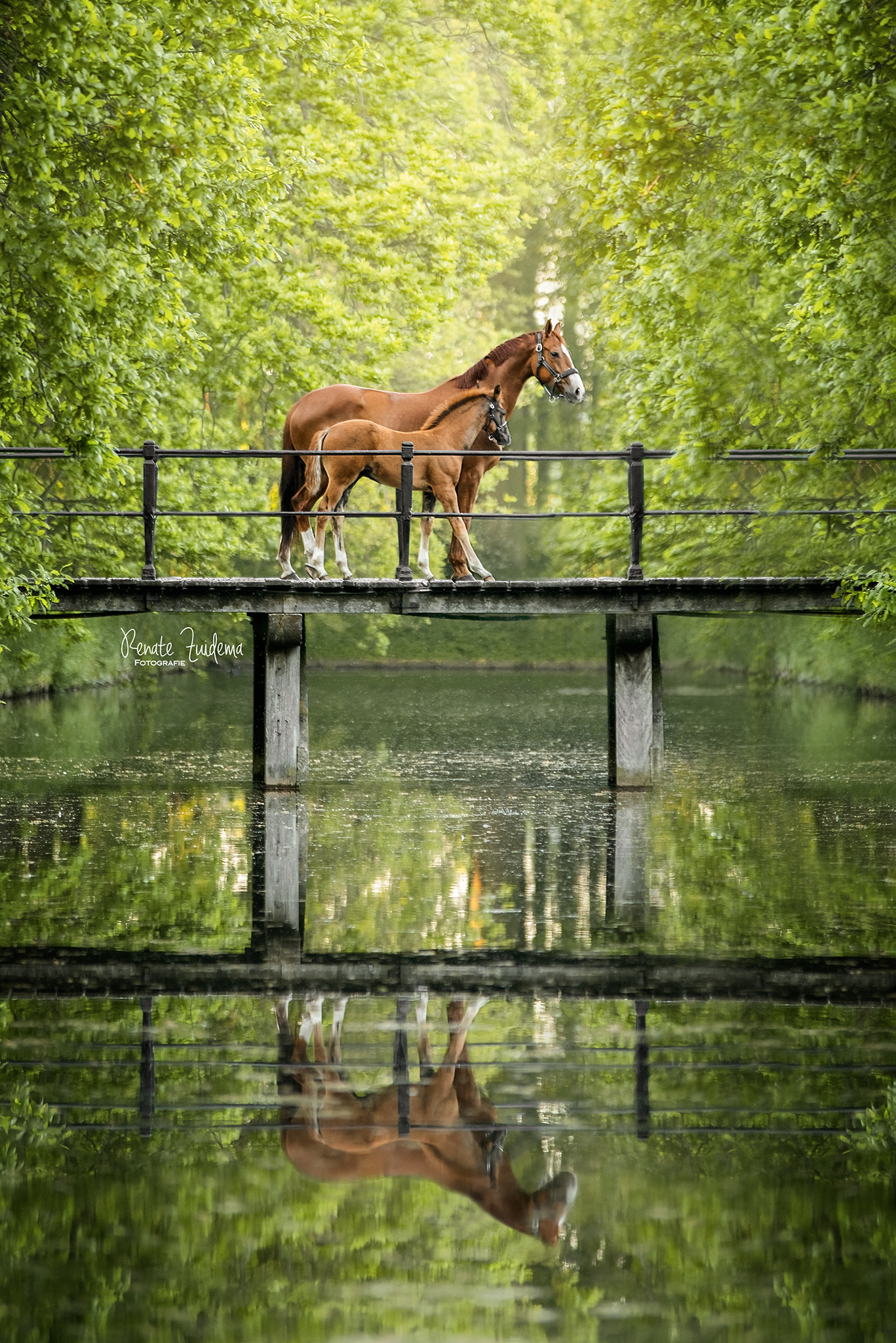 Merrie Karma en haar veulen Rhythm op een bruggetje met reflectie in het water.