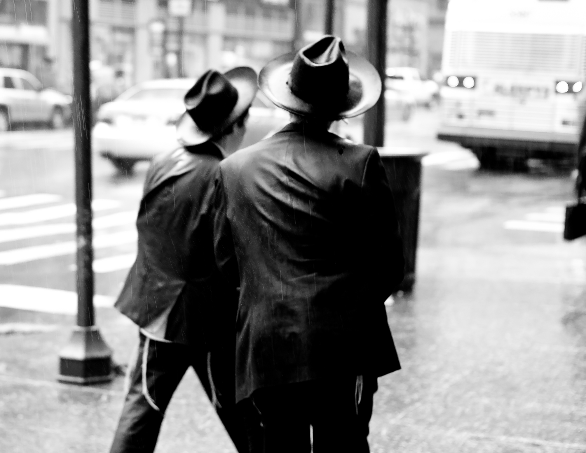 Twee Joodse jongens haasten zich een weg door de regen