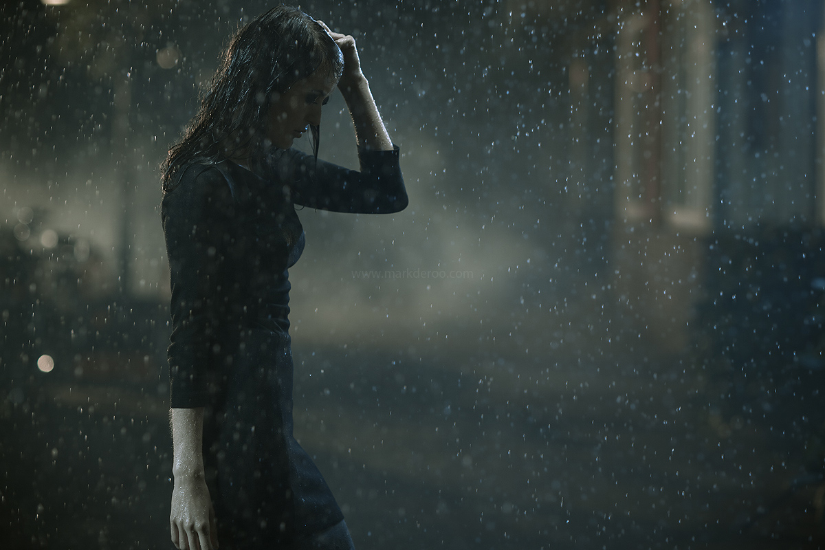 Een beeld in de regen! Naja, zo lijkt het. De regen is kunstmatig uit een tuinsproeier. En het licht/sfeer is gemaakt met behulp van flitsers.