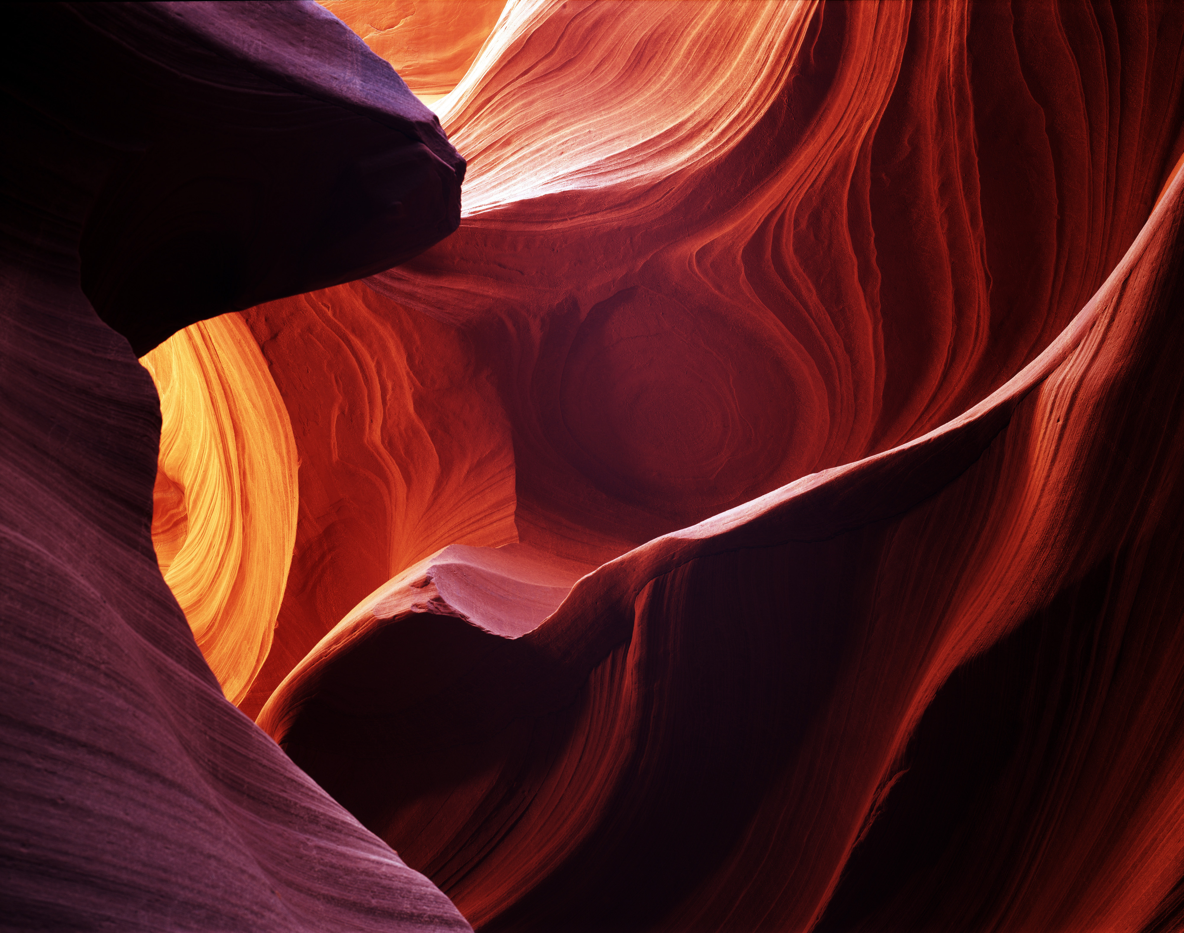 Dit is een detail van een slotcanyon. Deze rotsspleten zijn 1 a 2 meter breed en ongeveer 4 meter hoog. Door de secundaire licht inval krijg je de warme kleuren van de rotsen te zien. Deze foto is gemaakt met een medium formaat camera (zeg maar zo´n ouderwetse houten harmonica camera) met dia plakken van 4 bij 5 inch. Daarna zijn de diaplakken gedigitaliseerd. Sluitingstijd ca. 30 seconden waardoor de kleuren nog meer naar boven komen (Dia Fuji Velvia 4x5).