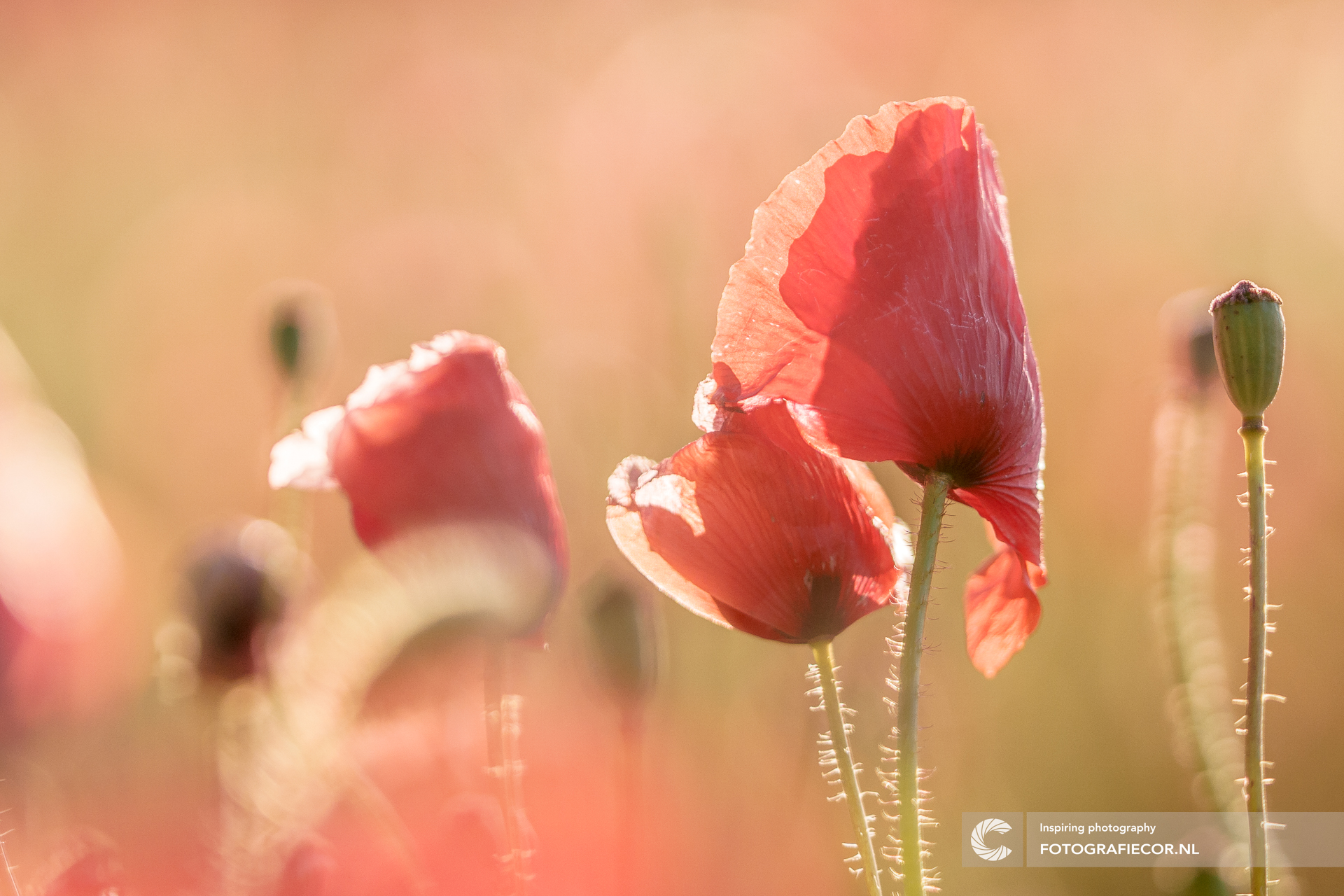 De zon zakte aan het einde van de dag langzaam aan de horizon weg terwijl het laatste avondlicht in een fleurig bloeiende zomerweide met wilde bloemen, sfeervol warm licht over het veld strooide. Het tegenlicht accentueerde het fragiele blad van de klaprozen en veranderende het landschap in pastelkleuren en zachte tinten wat met een 2.8 diafragma een fijne onscherpte achtergrond creëert.