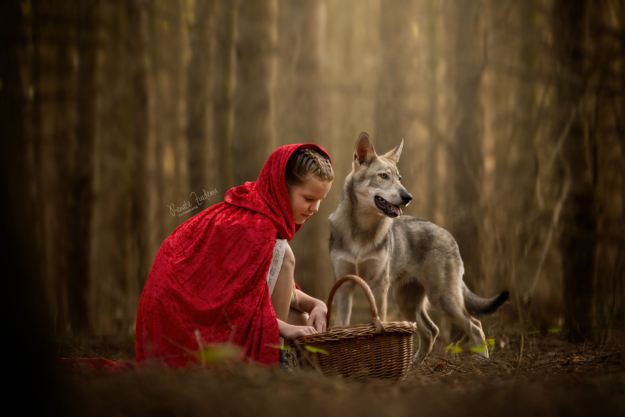 Lotte als Roodkapje samen met saarlooswolfhond Hunter.