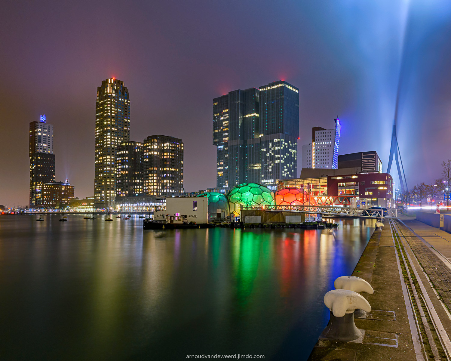 Afgelopen weekend een bezoek gebracht aan vrienden in Rotterdam. Het uitstapje stond niet echt in het teken van de fotografie, maar op het laatst toch maar de fotospullen meegenomen. 's Middags was het al erg nevelig en in eerste instantie dacht ik dat dit niet echt een ideale situatie zou zijn voor avondfotografie. Maar juist de spreiding van het licht in de nevel zorgt nu net voor een spectaculair effect in deze foto. Zo zie je maar weer dat er eigenlijk geen slecht weer bestaat voor avondfotografie :-). www.arnoudvandeweerd.jimdo.com
