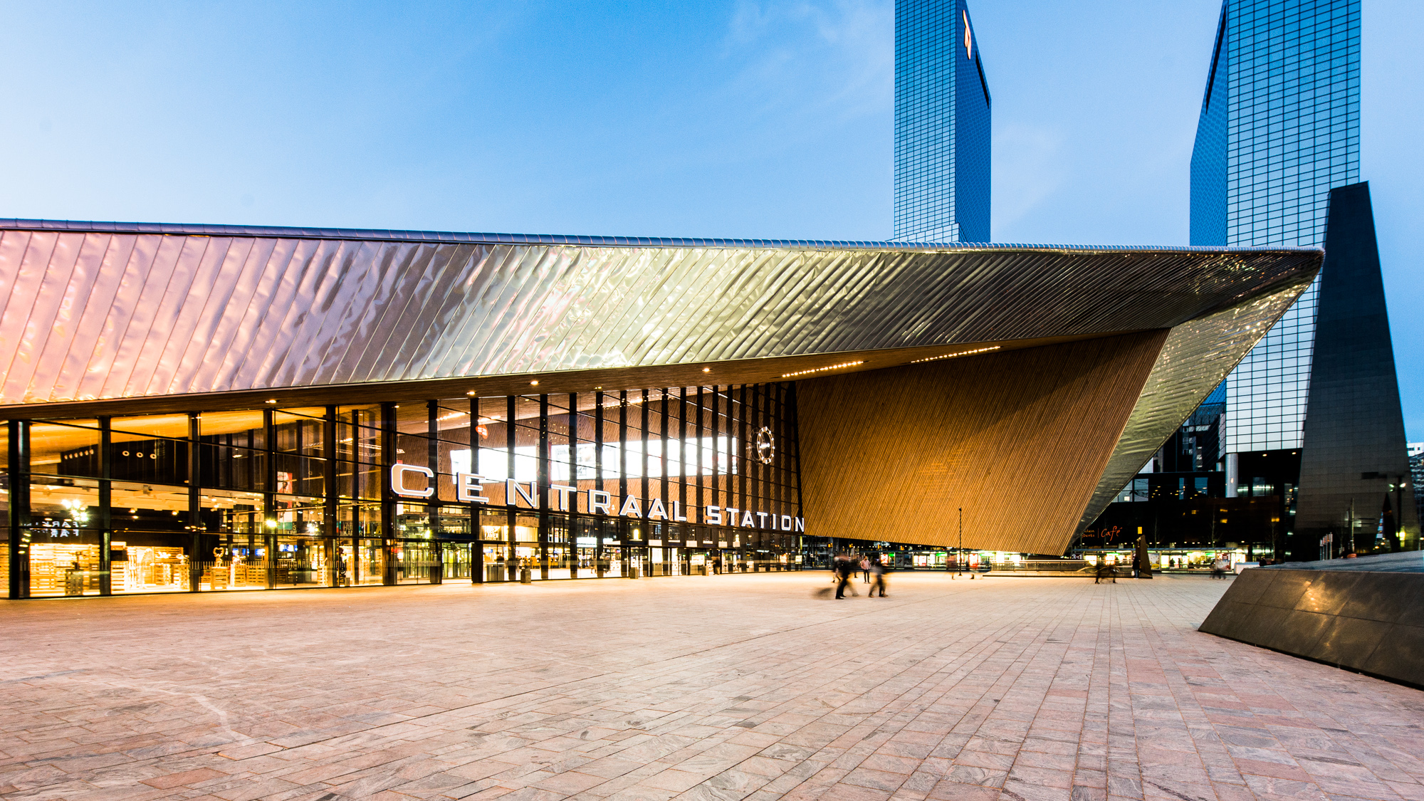Het Centraal Station in Rotterdam bij het vallen van de avond.