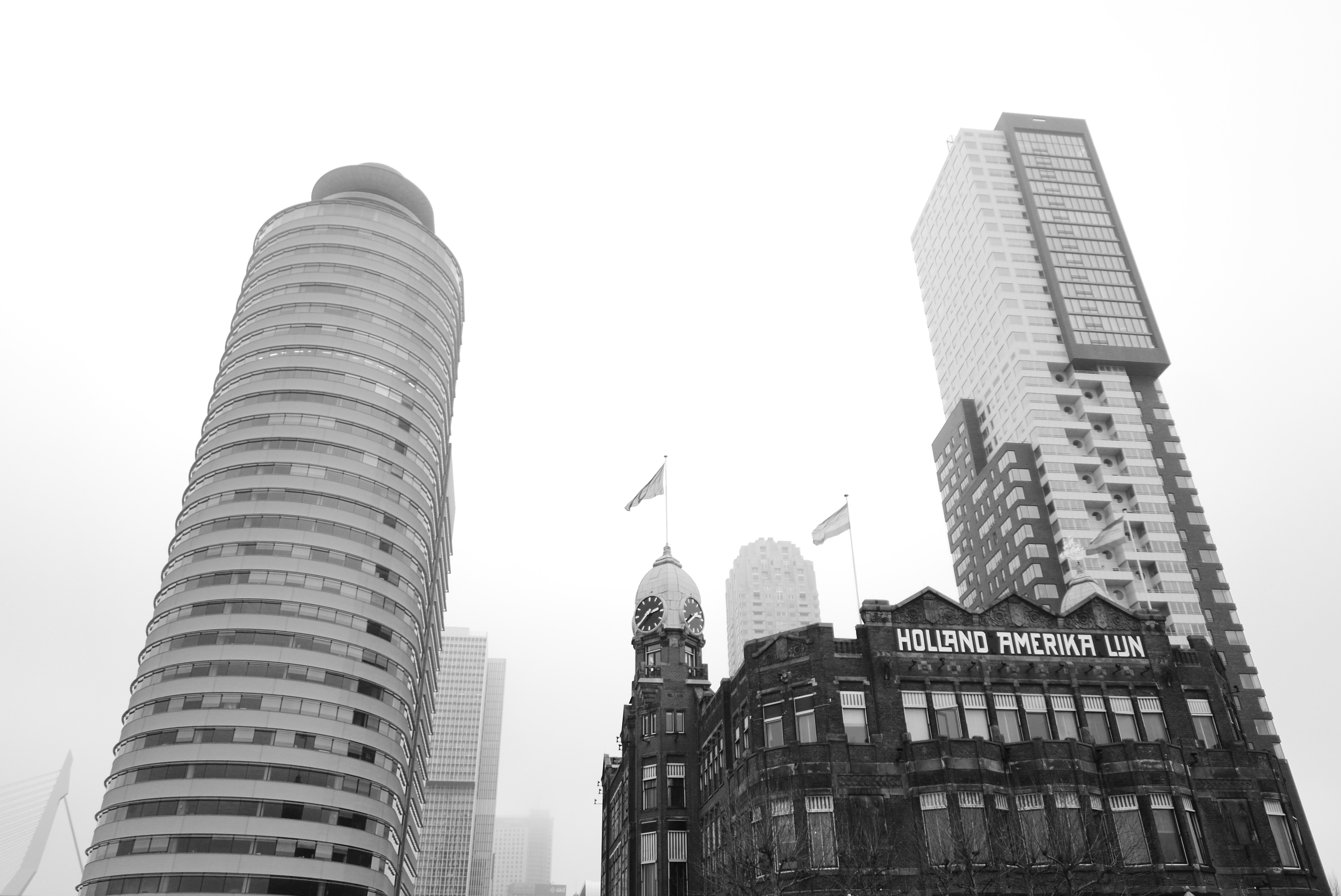 Zicht op hotel New York, iconisch gebouw van Rotterdam (links nog de Erasmusbrug zichtbaar).