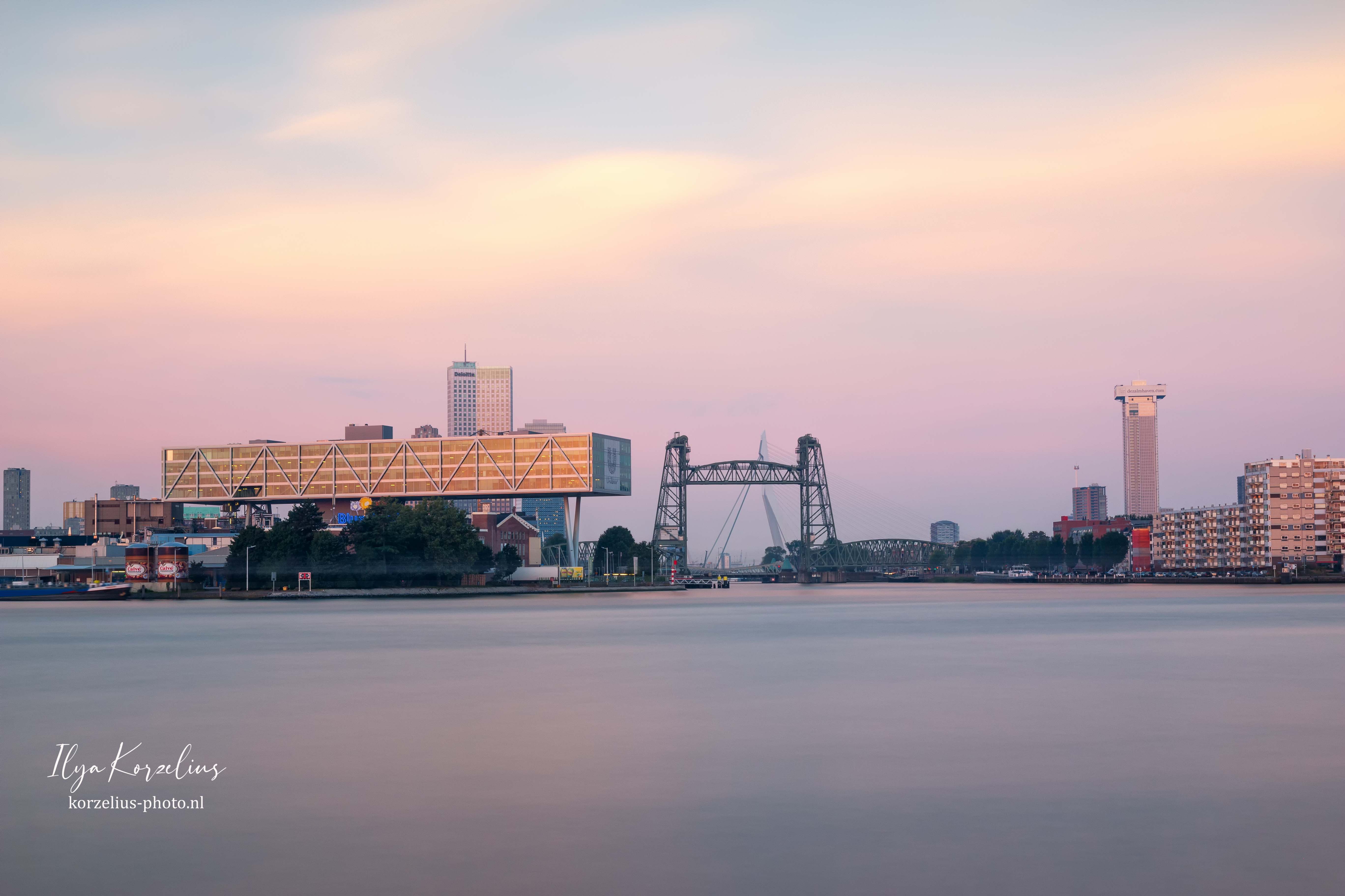 Rotterdam met zijn iconen bij zonsopkomst.