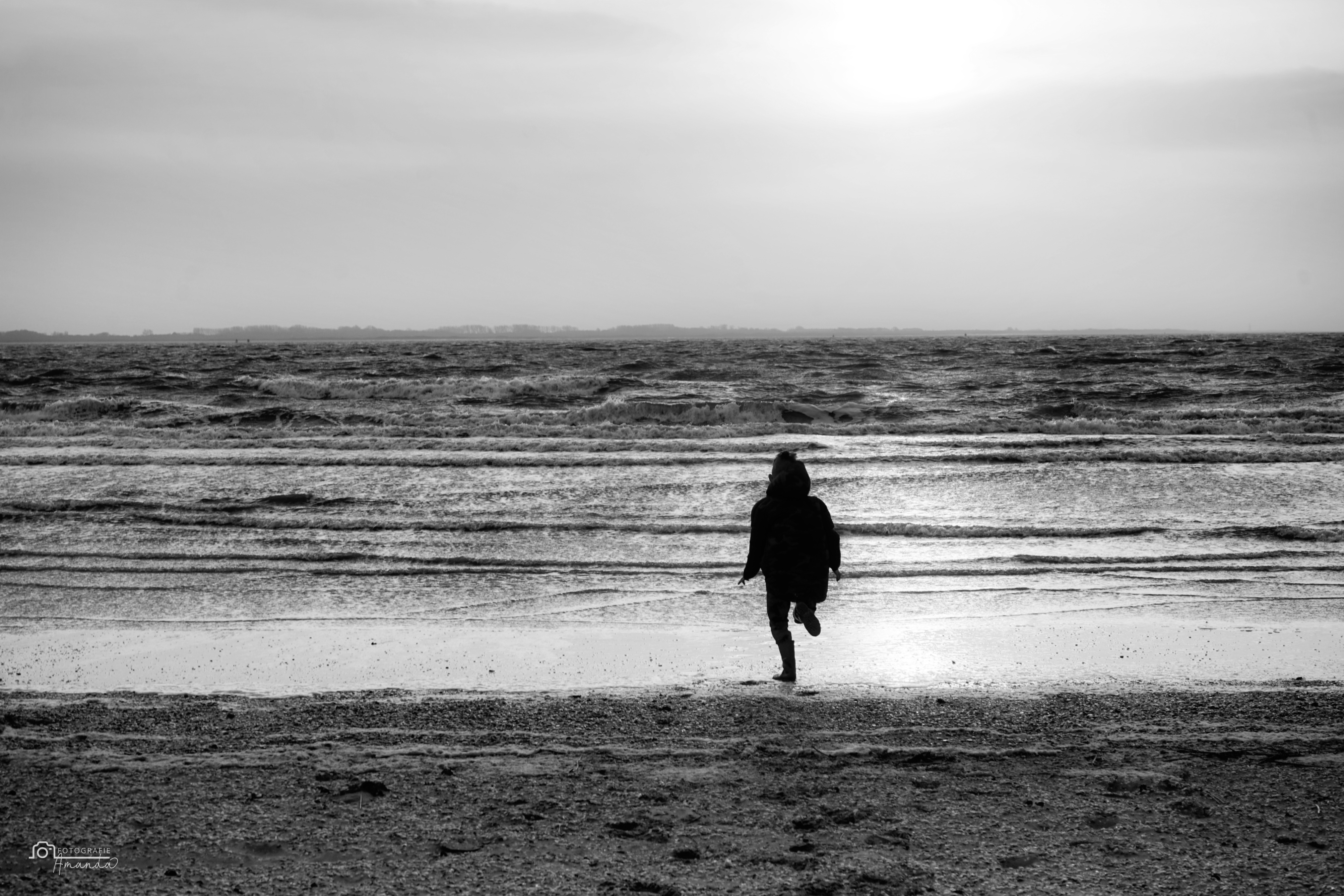 Hier rende mijn zoon de vloedlijn op, het zeewater trok zich vrij ver terug waardoor er een groot stuk strand open lag. Heerlijke golven, harde storm, even de elementen voelen.