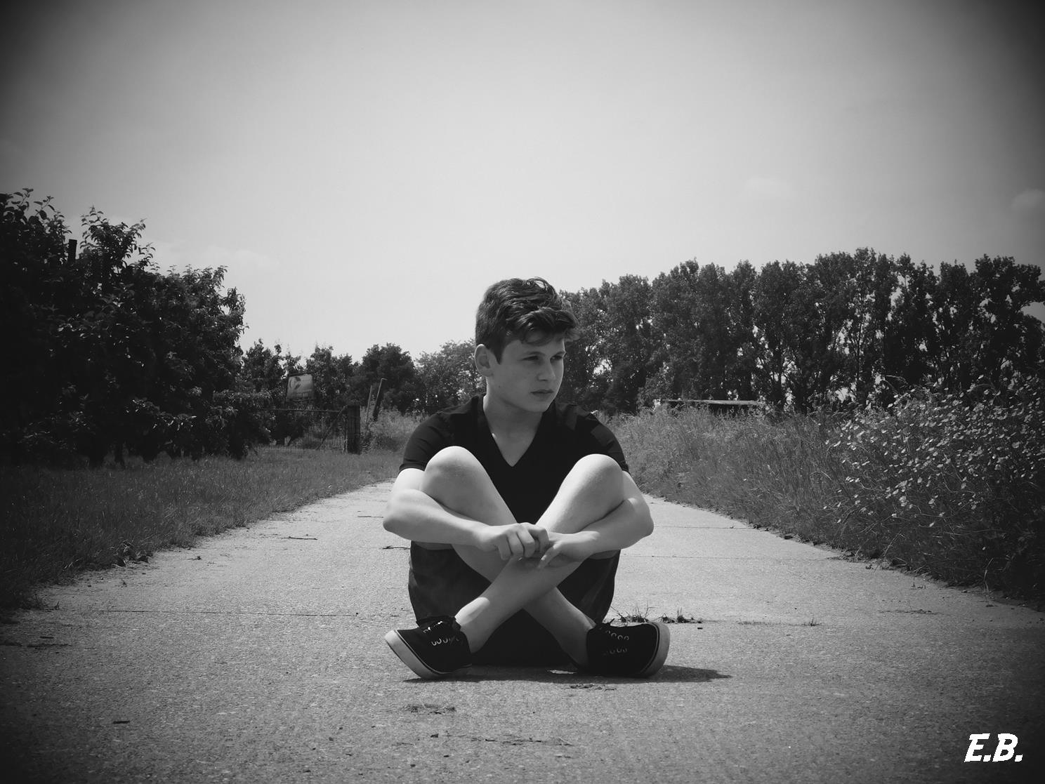 een jongen zit in het midden van een zeer rustige weg.