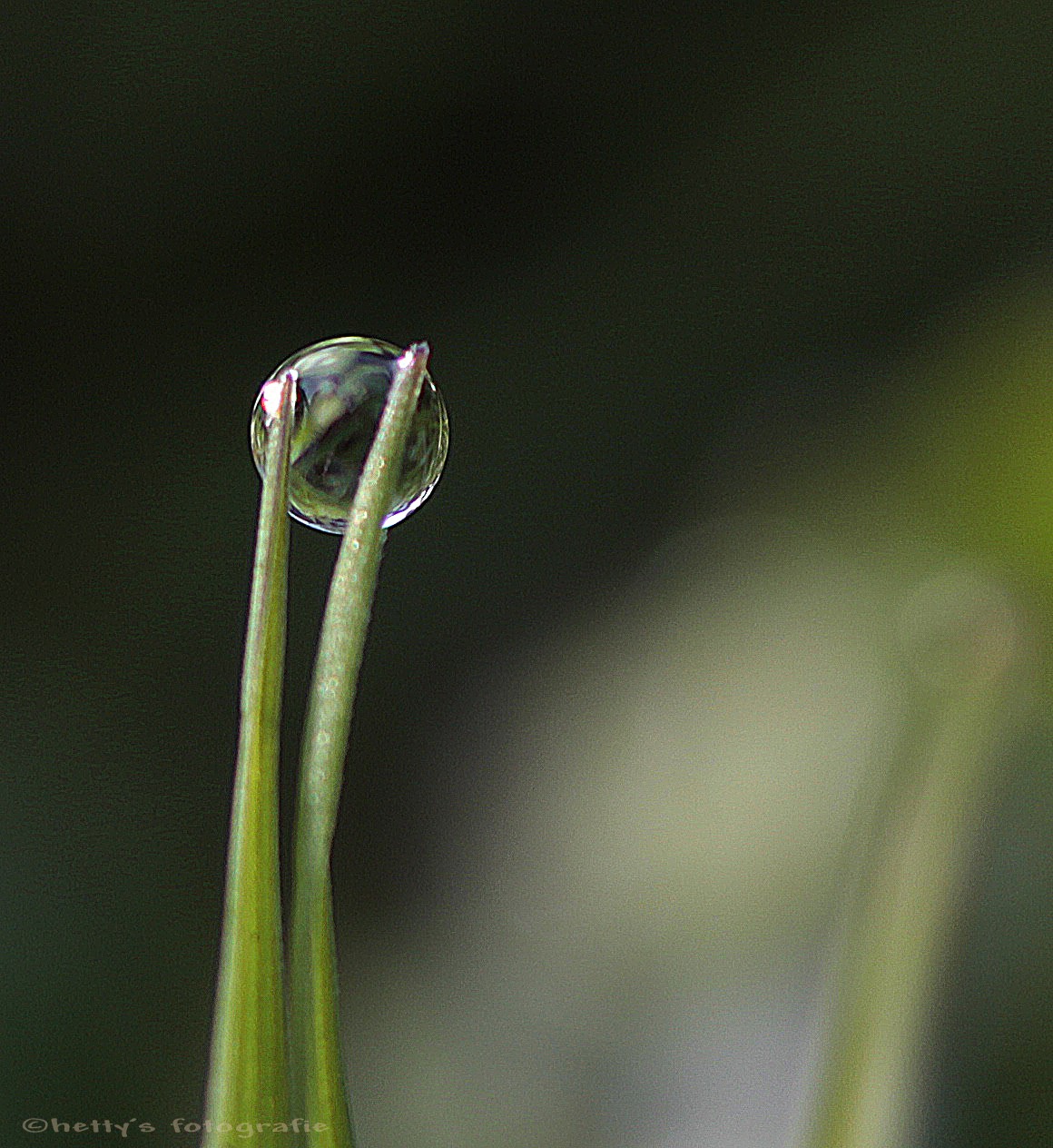 Dauwdruppel gedragen door twee grassprietjes.