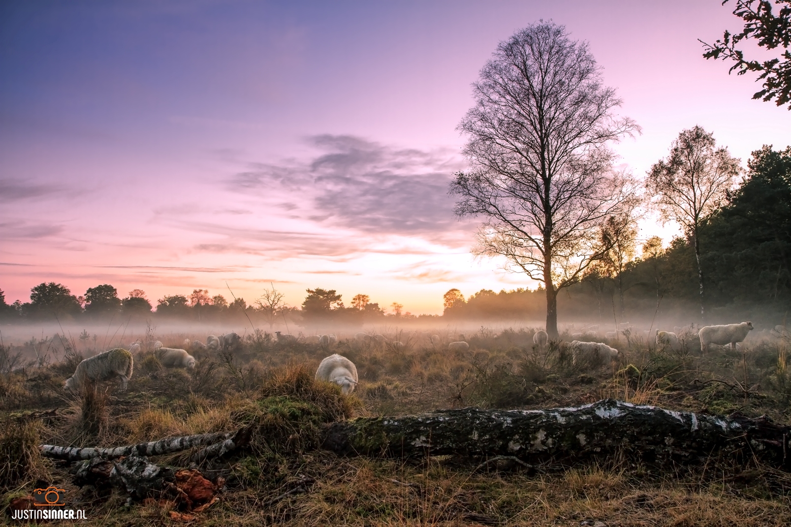 Schaapjes lopen door mist op de Veluwe vlakbij Nunspeet. Fijne avond, delen mag.