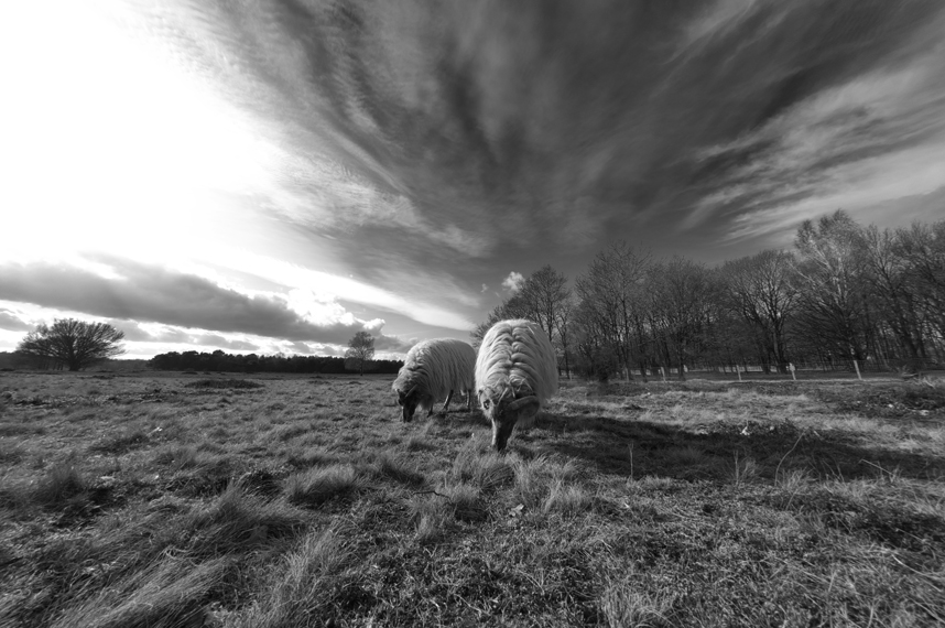 De schapen op de heide bij Bussum. Het voorjaar heeft erg mooie luchten die gefotografeerd in zwart/wit een mooi dramatisch geheel vormen met de schapen die weer op de heide rondlopen
